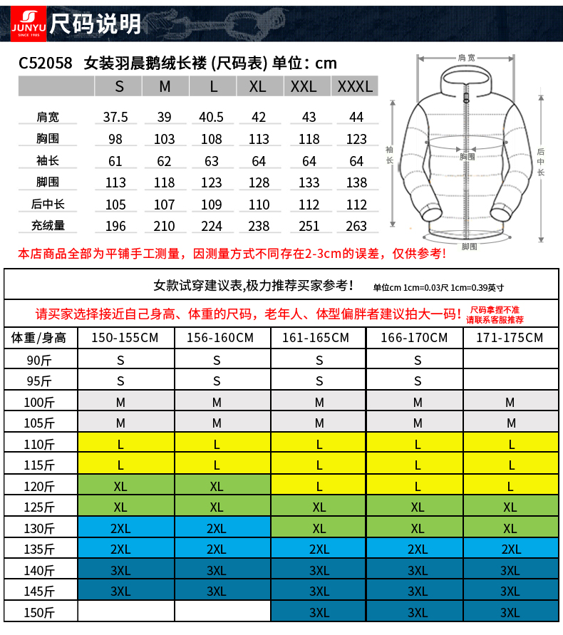 这款羽绒服的充绒量为:S码165克、M码179克、L码192克、XL码207克、XXL码221克、XXXL码231克