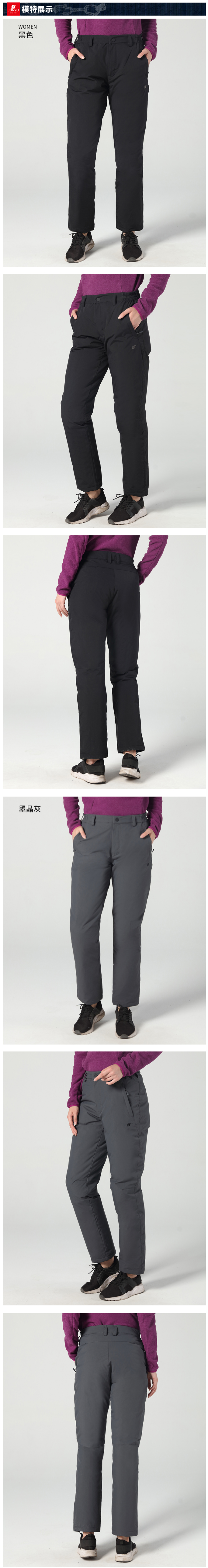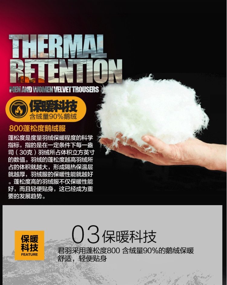 君羽雪巅男女加厚羽绒裤,填充800蓬90%鹅绒,男L码充绒量103克/女M码充绒量82克,属于中等厚度,防水阻渗透的压胶防绒面料,适合0℃到-15℃穿着。