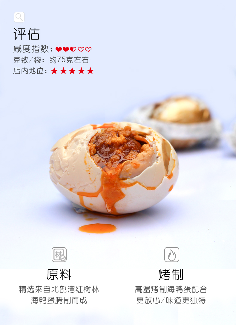 北部湾特产 烤海鸭蛋 70g*20枚真空装,70g特大个,产自北部湾红树林保护区,烤制的海鸭蛋浓香油多,蛋黄起砂,蛋白细嫩,口感爽滑,咸香可口,真空包装,携带保持方便,想吃就吃。注意,烤海鸭蛋因为经过烤制,所以蛋白有一点偏黄色的是正常的,和一般的白色蛋白不一样哦。