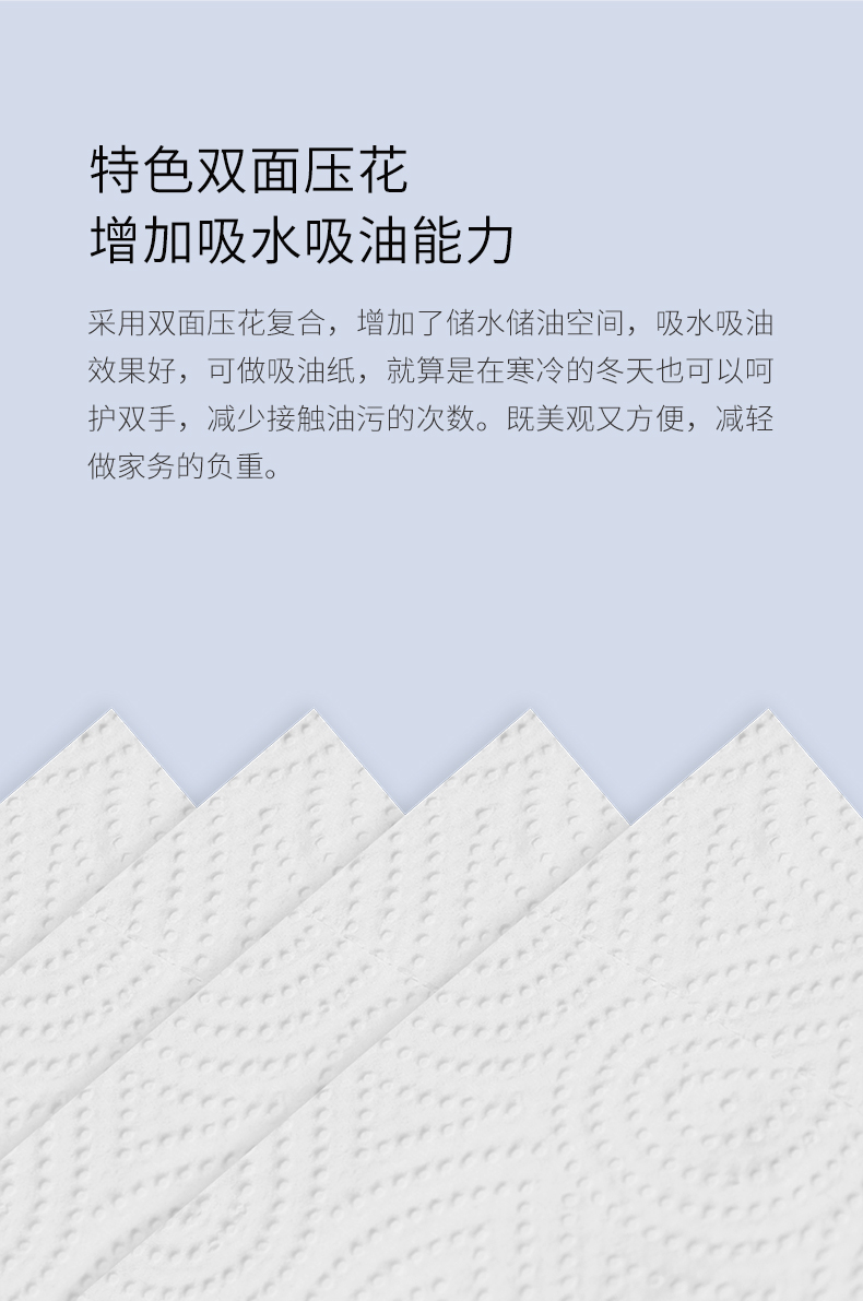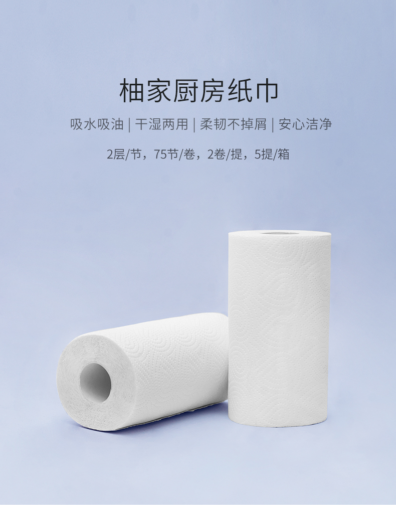 像油渍、不小心散落的调料、酱油等,纸巾抹完直接扔掉,避免了清洗抹布的麻烦步骤,也避免案板等滋生发霉,省心省力。规格2层*75节*10卷。