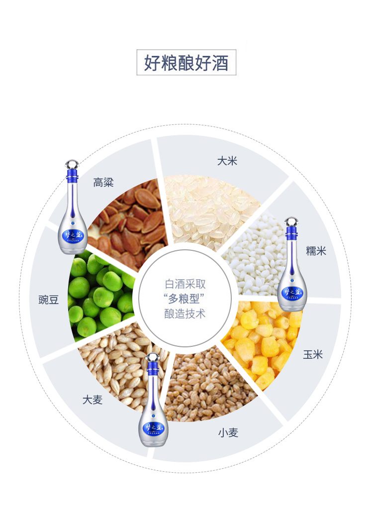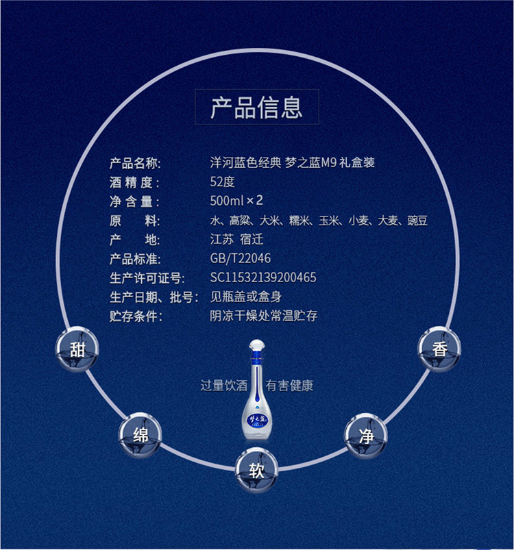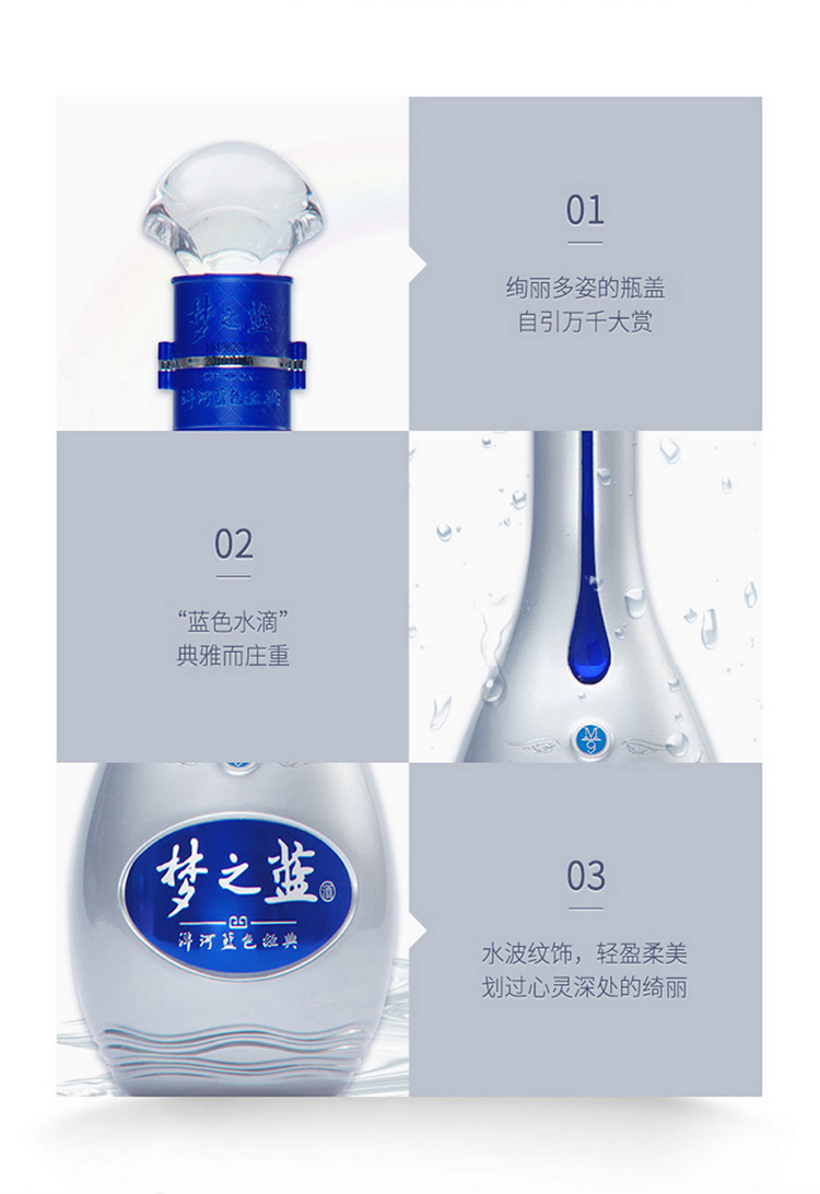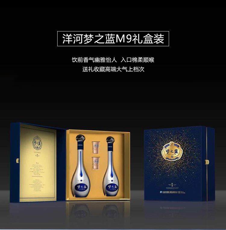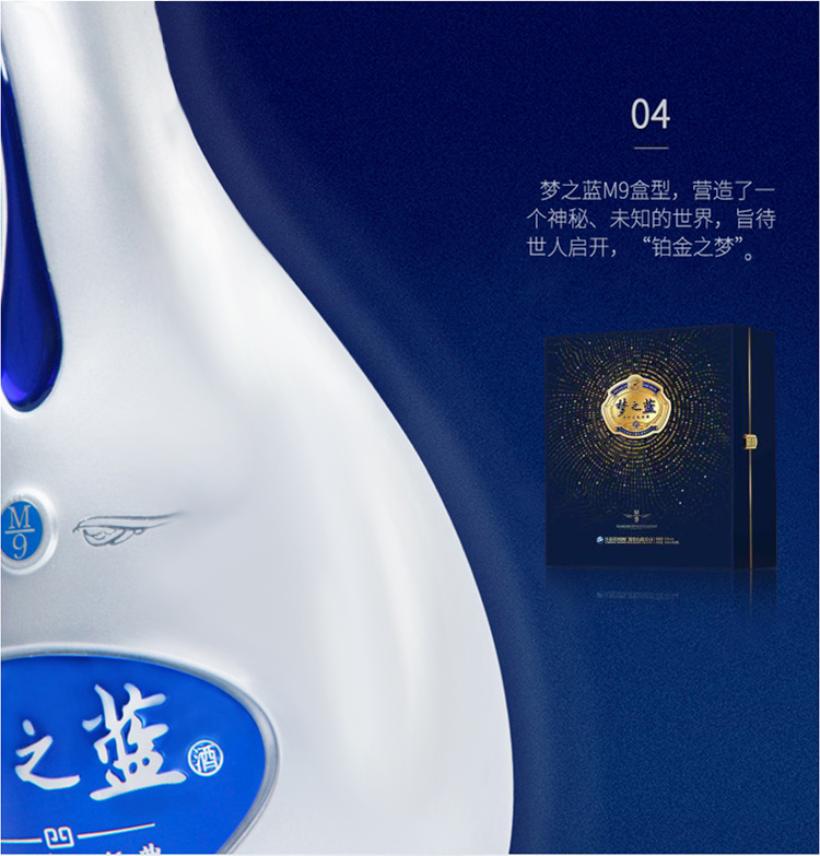 洋河梦之蓝是“蓝色经典“系列酒中定位最高端的酒款,从低到高有:遂之蓝、海之蓝、天之蓝、梦之蓝4个系列。其中梦之蓝从低到高又分M1(电商版)、M3、M6、M9四种不同定位酒款,数字越大品质越高。