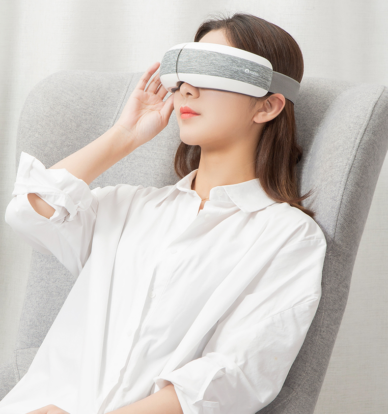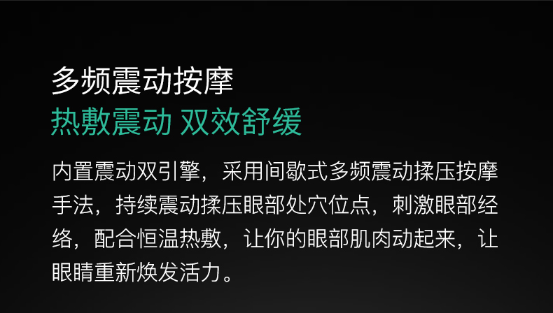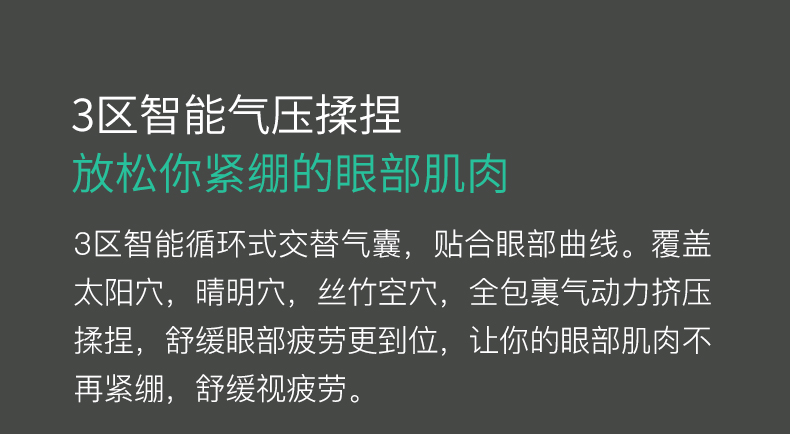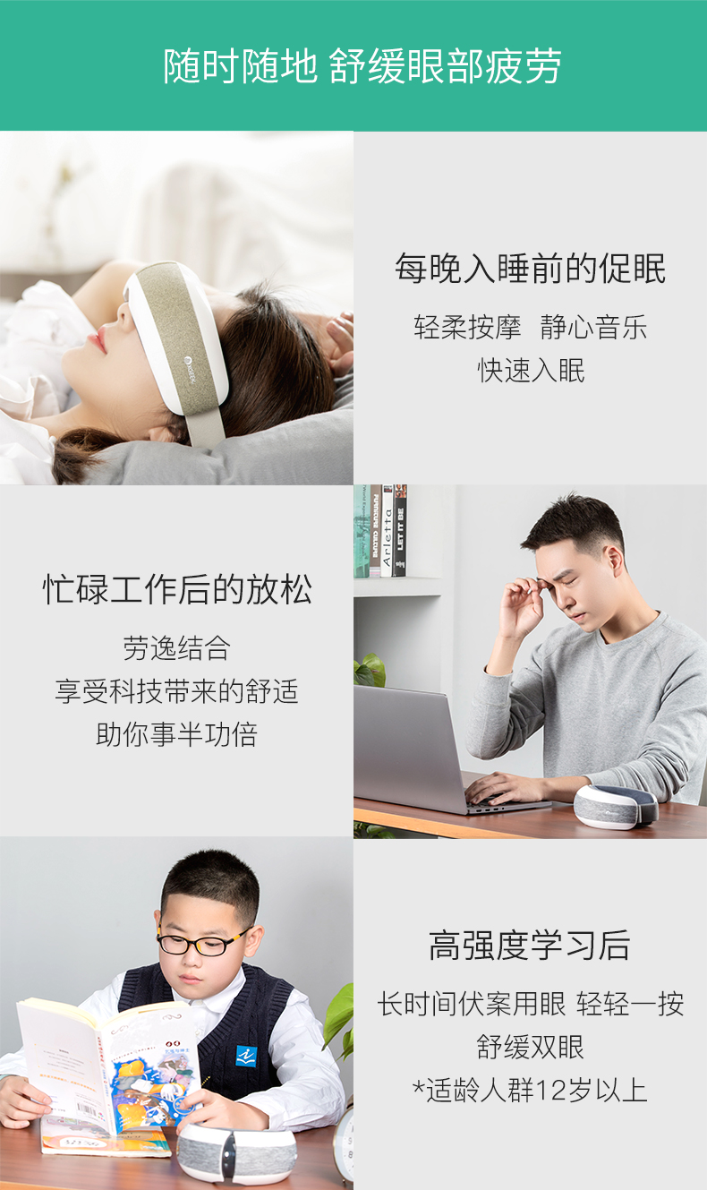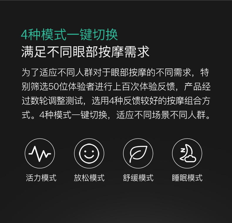 内置震动双引擎+3区全气囊包裹,贴合眼部曲线,覆盖太阳穴,晴明穴,丝竹空穴。采用间歇式多频震动揉压按摩手法,智能循环式交替,持续震动揉压眼部处穴位点,刺激眼部经络,拥有活力模式、放松模式、舒缓模式、睡眠模式、4种按摩模式一键切换,适应不同场景不同人群。
