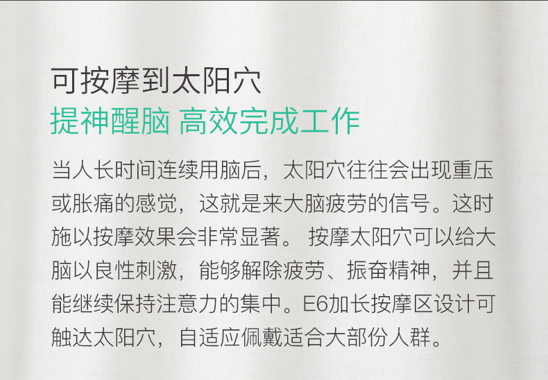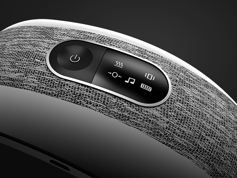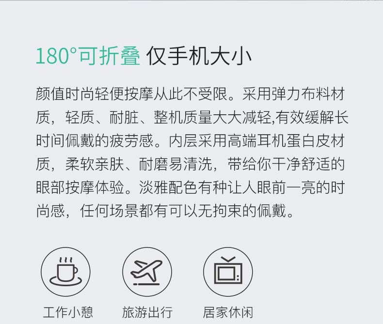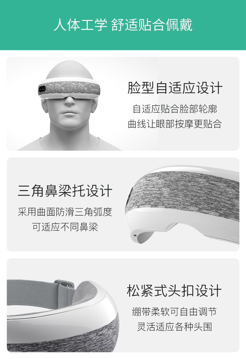 细节上:采用弹力布料材质,轻质、耐脏、整机质量大大减轻,有效缓解长时间佩戴的疲劳感。内层采用高端耳机蛋白皮材质,柔软亲肤、耐磨易清洗,带给你干净舒适的眼部按摩体验。