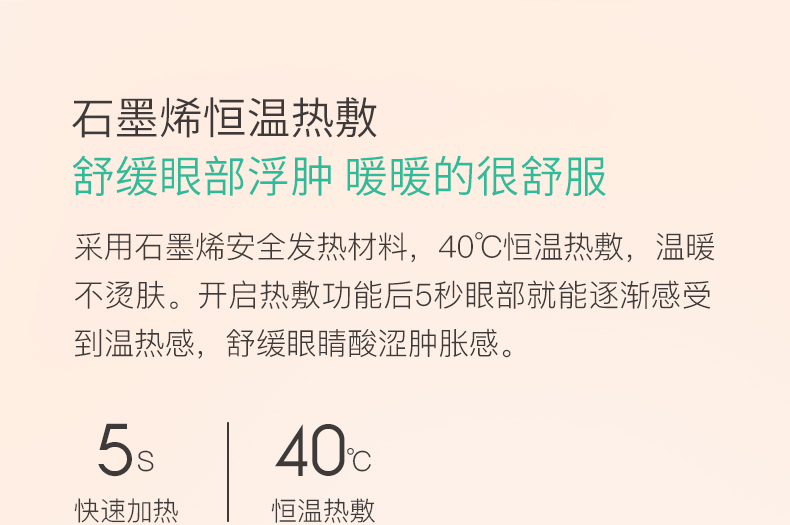 配合石墨烯40℃恒温热敷,开启5秒即能感受热感,温暖不烫,可舒缓眼部酸涩肿胀感。石墨烯被称为“黑金”“材料之王”,是目前世界最薄的,强度最高,透光最好,导电最好,导热也是最好的纳米材质。