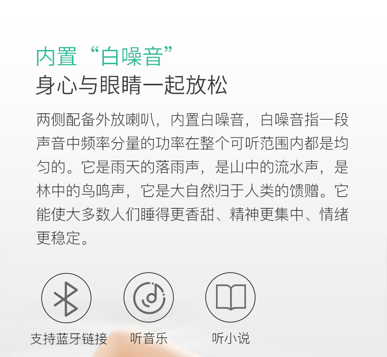 支持蓝牙连接可听音乐、听小说;两侧配备外放喇叭,内置白噪音,白噪音指一段声音中频率分量的功率在整个可听范围内都是均匀的。它能使大多数人们睡得更香甜、精神更集中、情绪更稳定。内置1200MAH聚合物锂电池,充电一次可用12天。