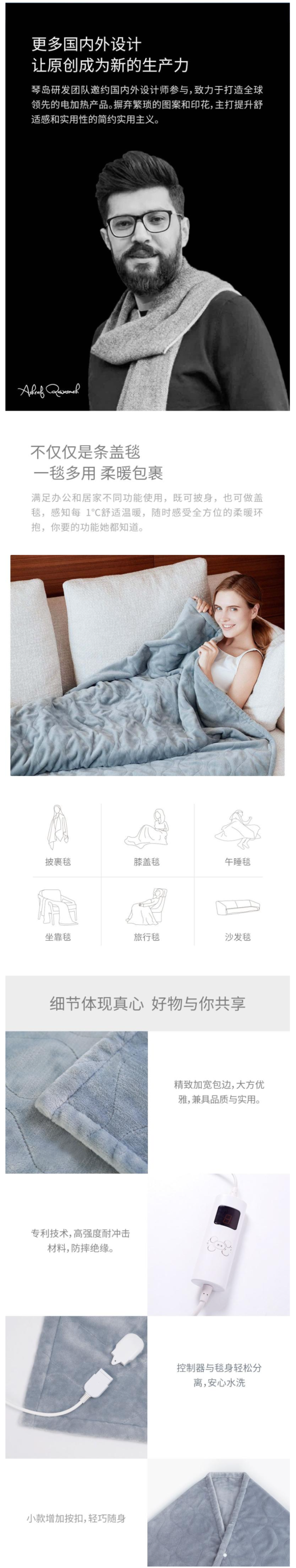 琴岛 电热盖毯,柔软法兰绒面料,260g法兰绒纤维,绒毛紧密细致,升温后法兰绒表面长绒形成隔层,保温性能更好。可作为膝盖毯,午睡毯,沙发毯等随意披盖,多个使用场景。