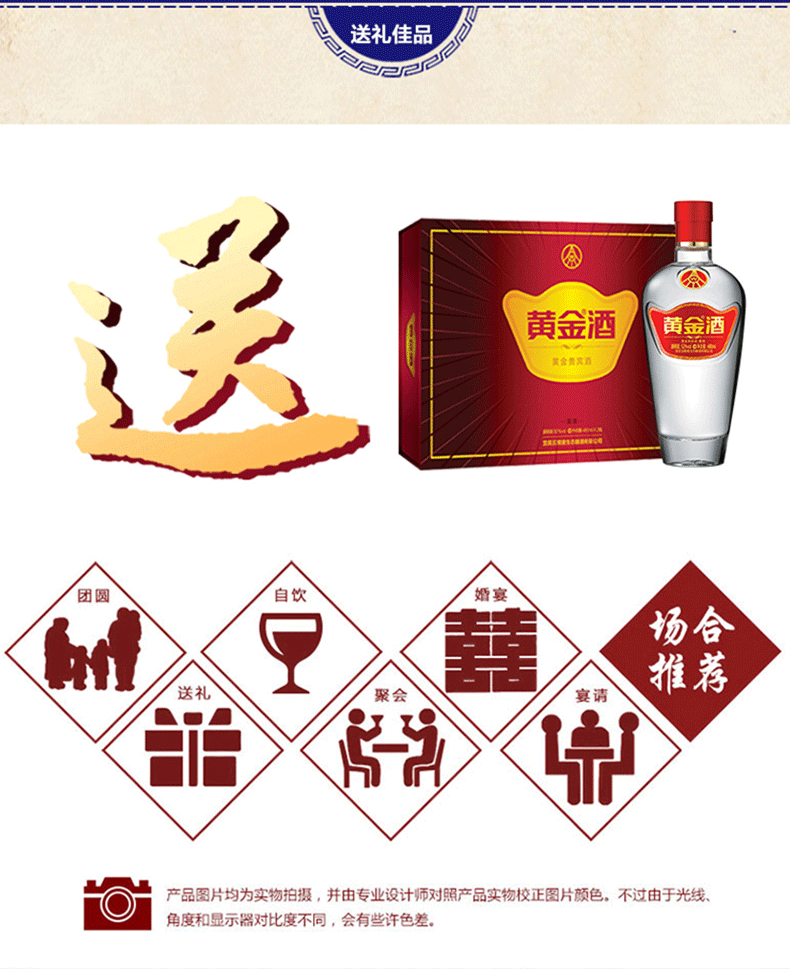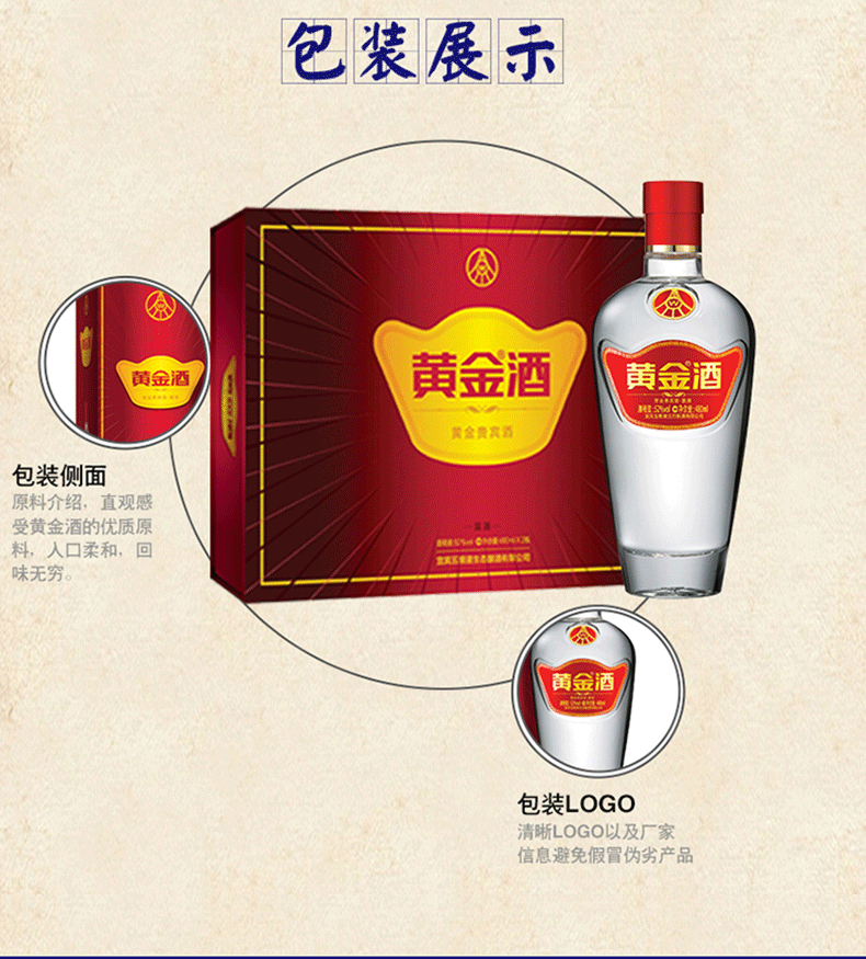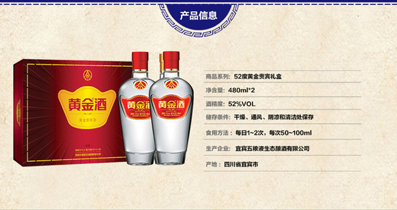 黄金52度酒贵宾礼盒以蛹虫草,葛根、青果、枳梖子、山楂、山药、益智仁山药为原料酿制而成,黄金酒酿酒技艺沿袭千年,酒液澄澈口感醇厚,入口绵柔细腻爽净,余味悠长浓香突出,整体协调丰满。酒精度52% vol。规格480ml*2瓶。