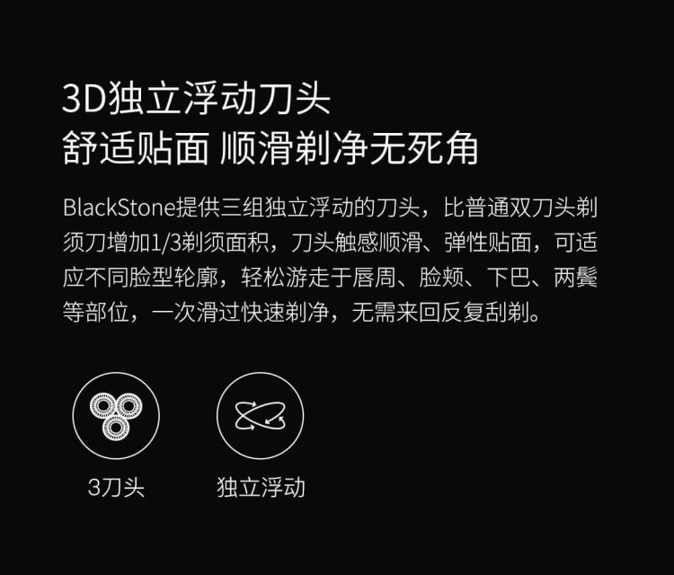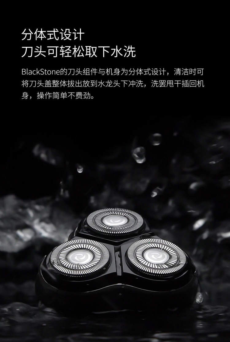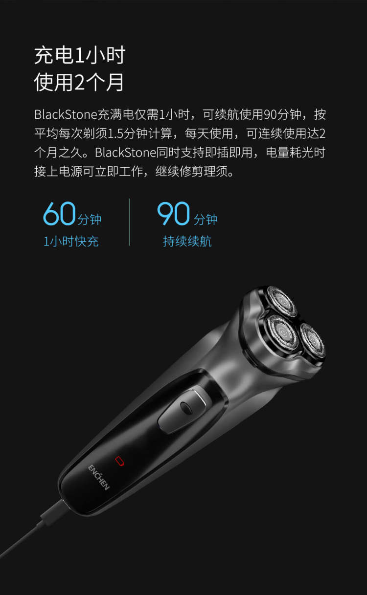 充满电仅需1小时,可续航使用90分钟,按平均每次剃须1.5分钟计算,每天使用,可连续使用达2个月之久。BlackStone同时采用Type-C USB充电接口,支持即插即用,电量耗光时接上电源可立即工作。作为一个售价39.9的剃须刀来说,配置基本上看齐了百元级别的剃须刀了,是性价比选手。
