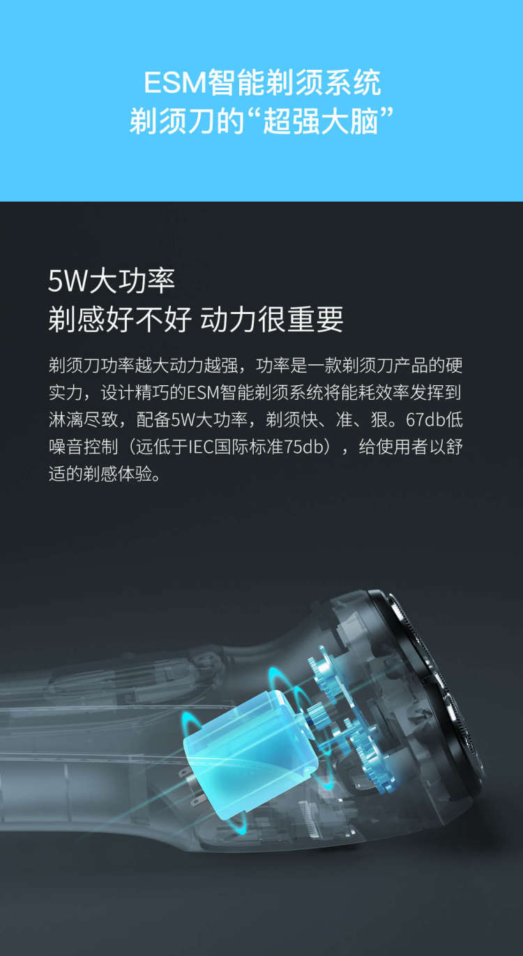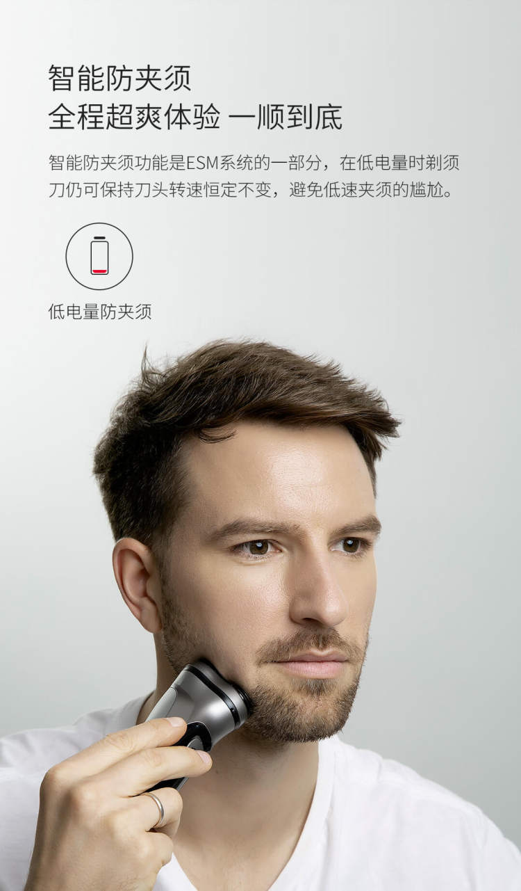 刀片是由日本进口钢制成,ESM智能剃须系统配备5W大功率。67db低噪音控制(低于IEC国际标准75db)。智能防夹须功能是ESM系统的一部分,在低电量时前须刀仍可保持刀头转速恒定不变,避免低速夹须的尴尬。
