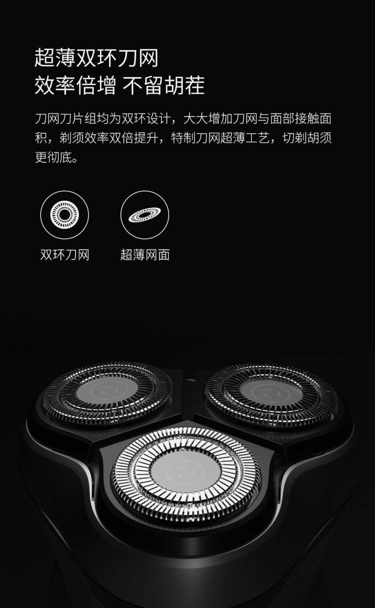 3D独立浮动刀头,弹性贴面,使用时通过3个刀头小范围的移动,游走于唇周、脸颊、下巴、两鬓等部位,超薄的双环刀网,在关闭状态下甚至可以透过刀网看到下面的刀头。