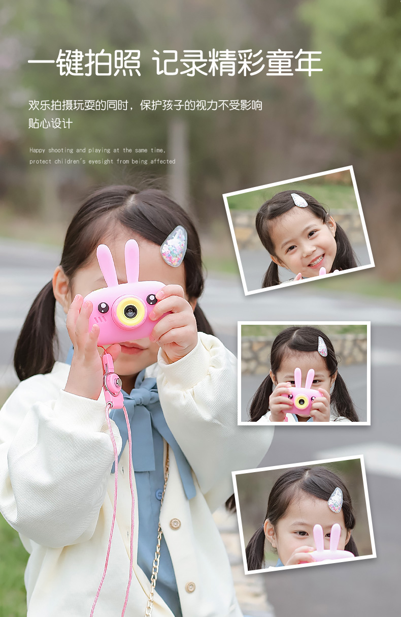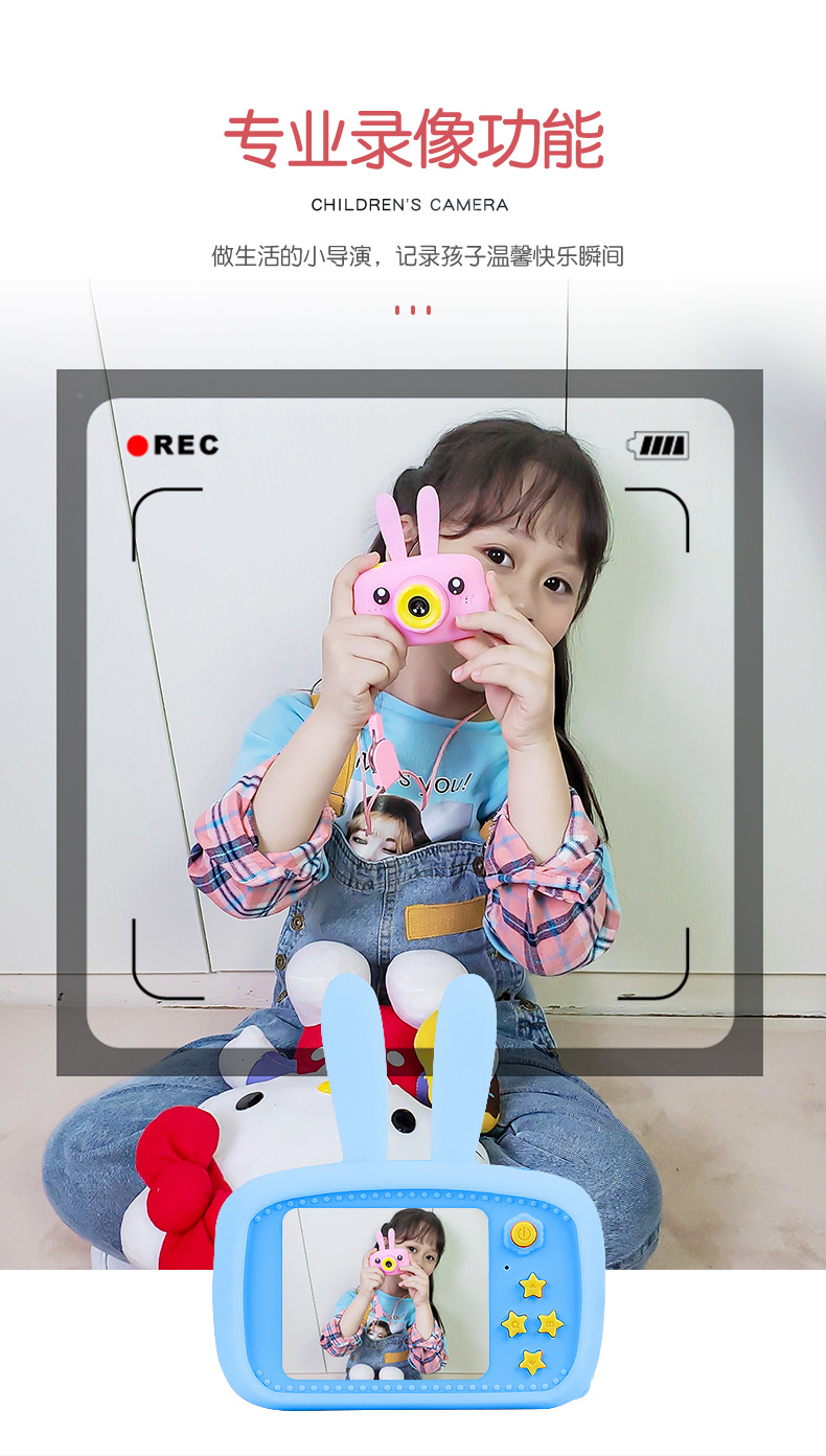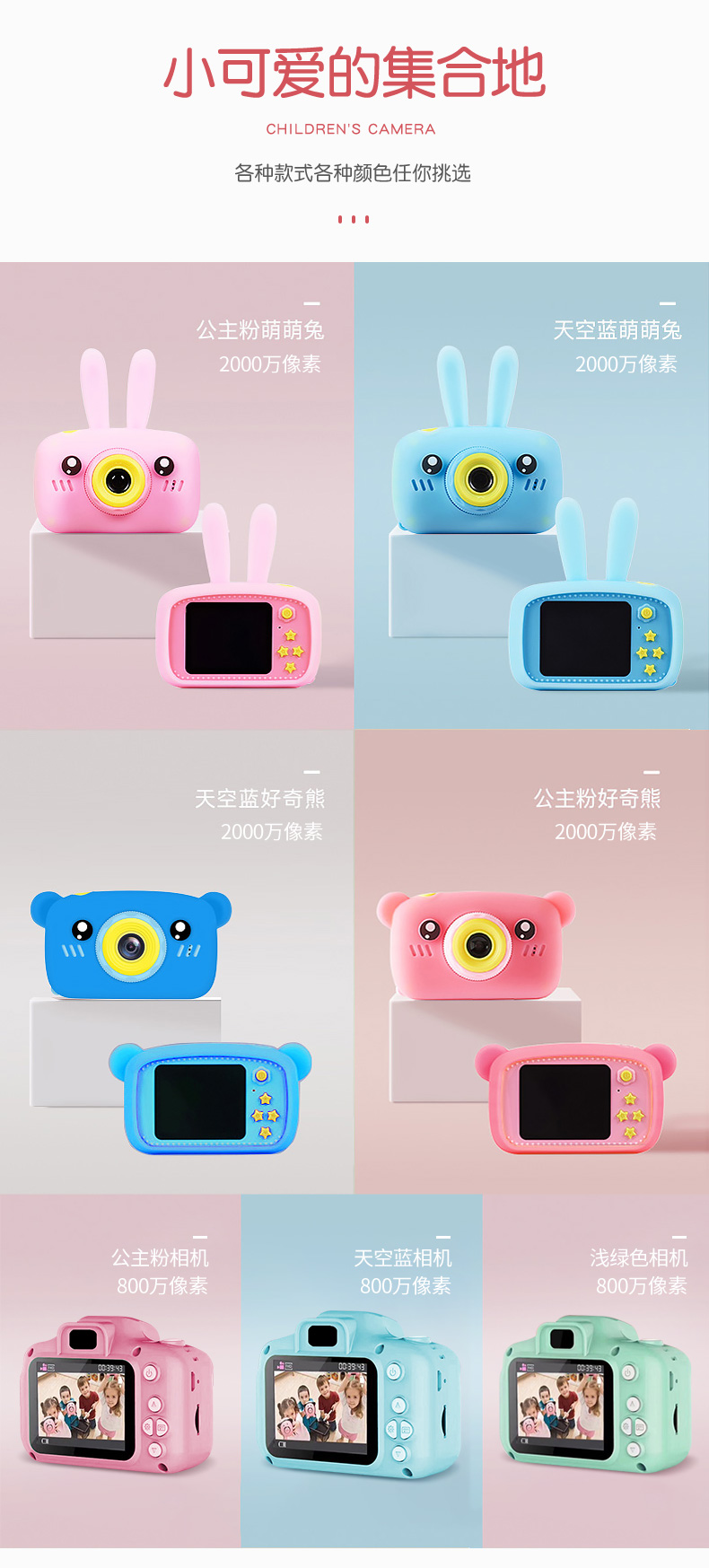 这款儿童卡通数码相机,2.0时IPS护眼高清屏,2000w高清像素,高清画质,拍照录像一机搞定,自动对焦/调色/调光,按压式操作,非常简单。