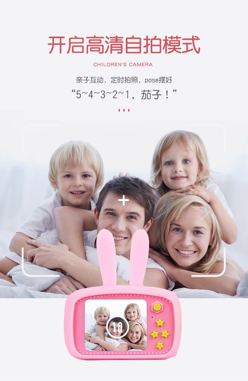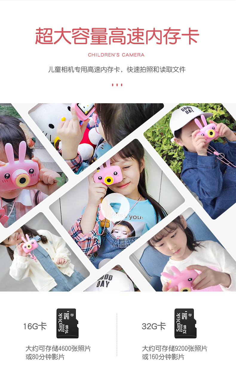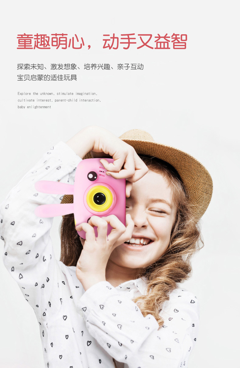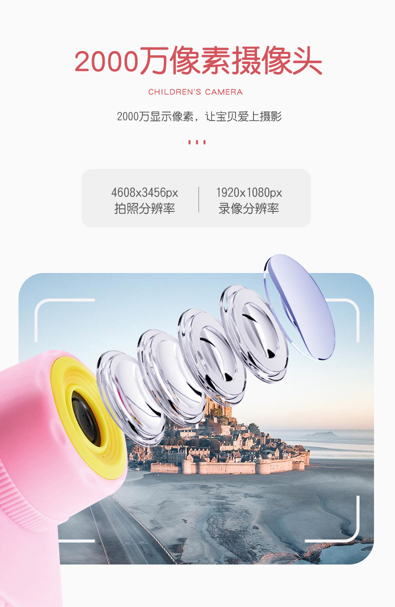 这款儿童卡通数码相机,2.0时IPS护眼高清屏,2000w高清像素,高清画质,拍照录像一机搞定,自动对焦/调色/调光,按压式操作,非常简单。