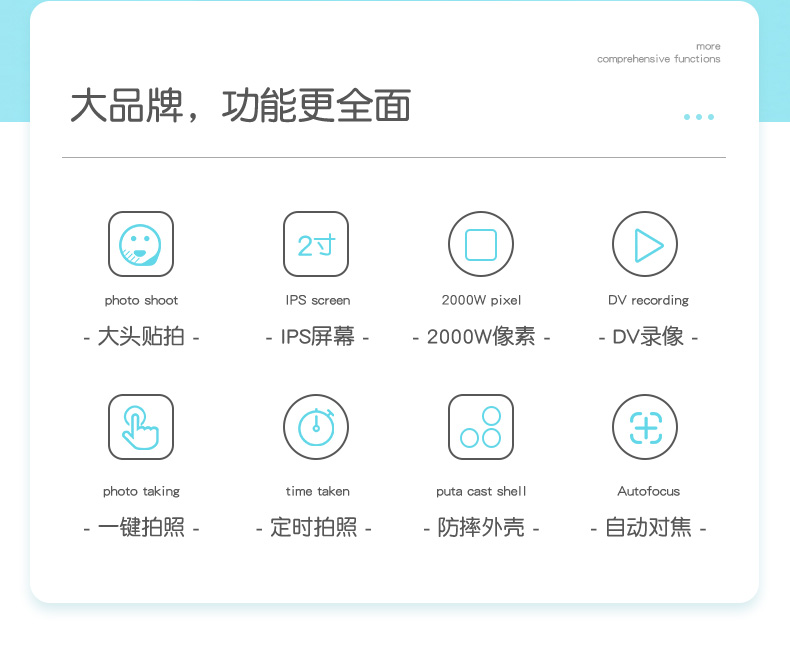 裸机经过暴力跌落测试,防摔耐用。具备DV录像功能,玩法多样。600mah大电量,充满电可连续拍照2000多张。内置趣味大头贴,都是孩子喜欢的卡通元素。