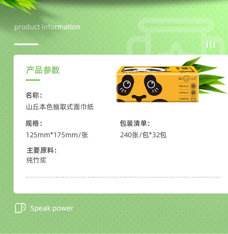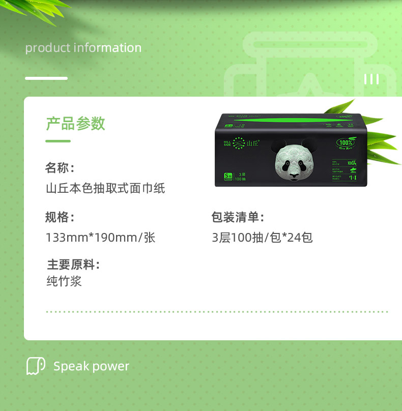 这款山丘 本色抽纸100抽,荣获2019德国IF设计奖,红点设计奖,有实力更有颜值。甄选卧龙、都江堰、碧峰峡三个熊猫保护基地的猫口粮嫩竹,原生竹浆,含有“竹琨”,抑菌抗菌除螨,柔软亲肤,韧性十足。食品级别用纸,不含添加剂,不含荧光漂白剂,安全放心使用。欧美食品级认证,宝宝撕咬也不怕。3层加厚,擦拭不掉屑。温和吸水,无荧光剂,肌肤接触零距离,可充当备用卸妆棉。规格:133*190mm/张 3层100抽/包*24包。