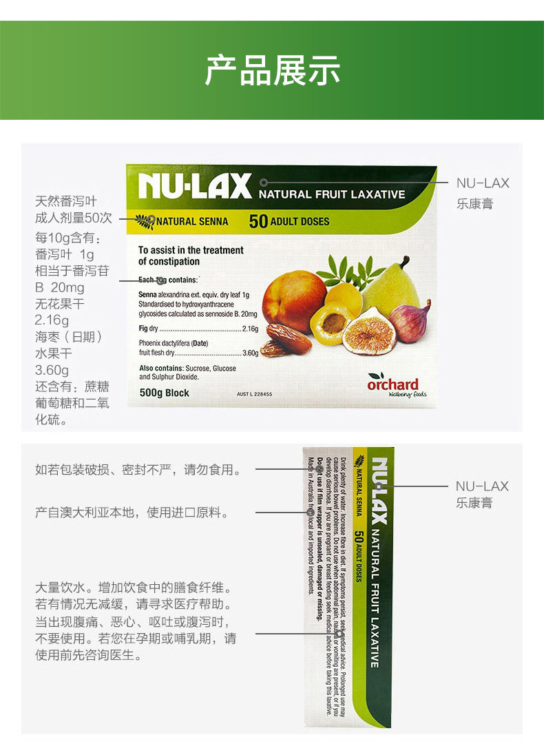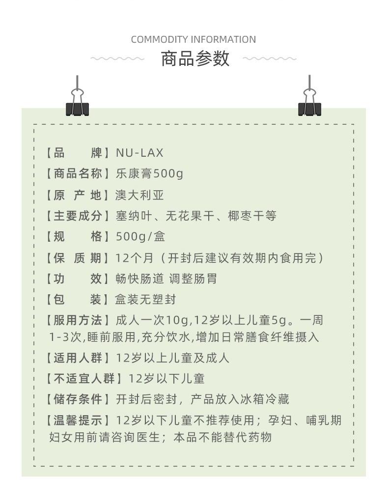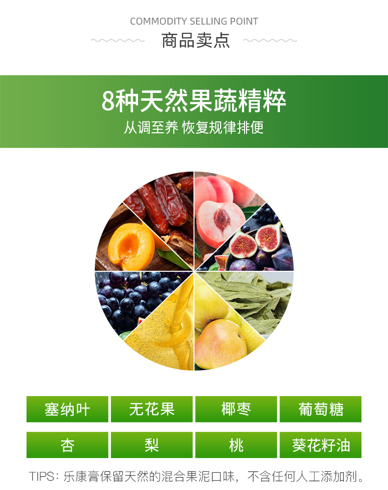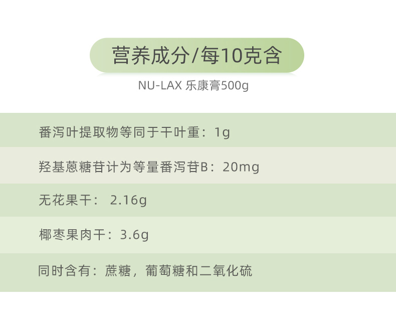 采用100%纯天然成分,包含多种混合水果纤维,每10g含800mg塞纳叶粉,具有润肠排便功能,添加的蔗糖和葡萄糖成分使成分偏甜。膏状,不含有任何人工添加剂和化学物质,可放心食用。