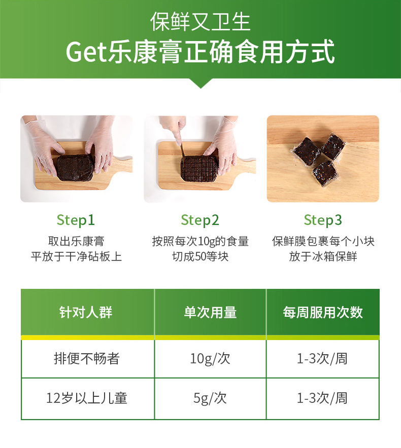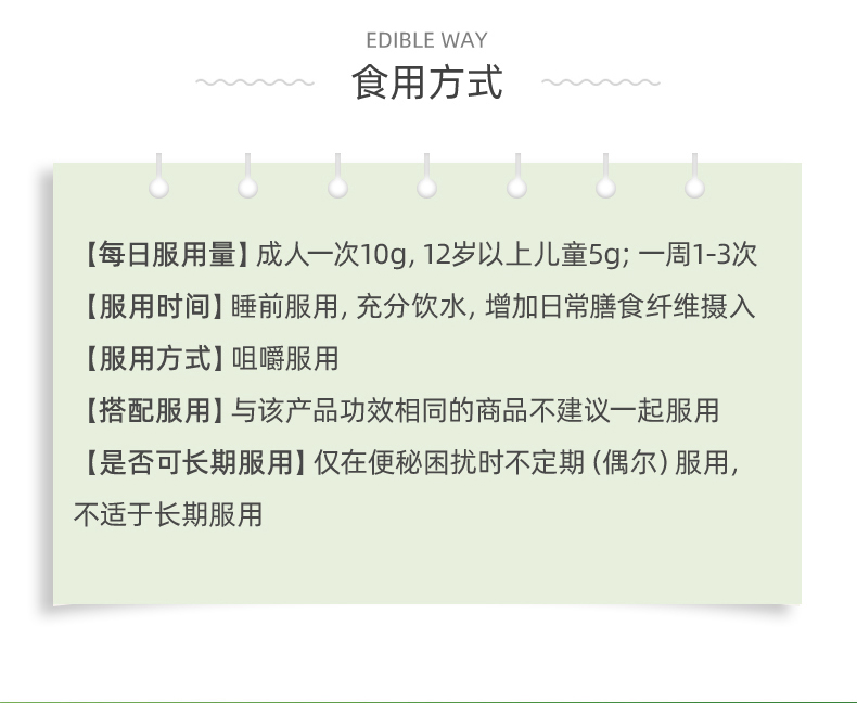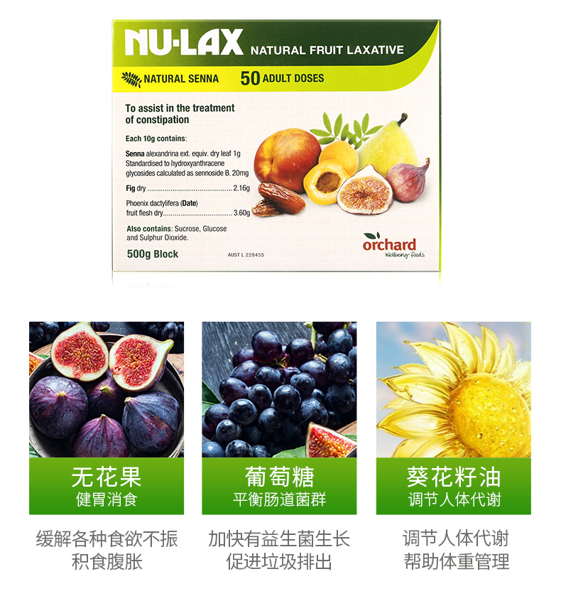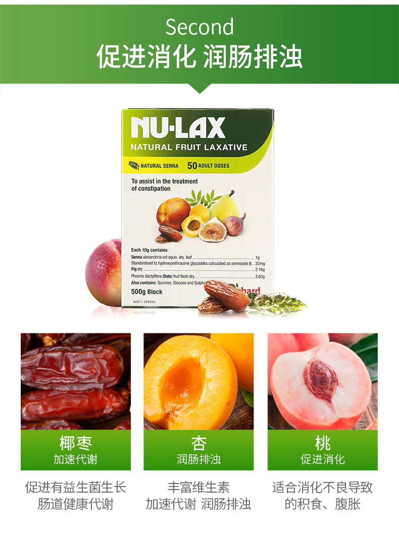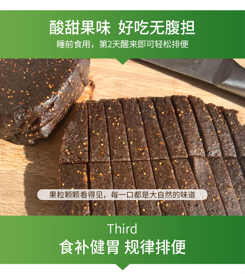采用100%纯天然成分,包含多种混合水果纤维,每10g含800mg塞纳叶粉,具有润肠排便功能,添加的蔗糖和葡萄糖成分使成分偏甜。膏状,不含有任何人工添加剂和化学物质,可放心食用。