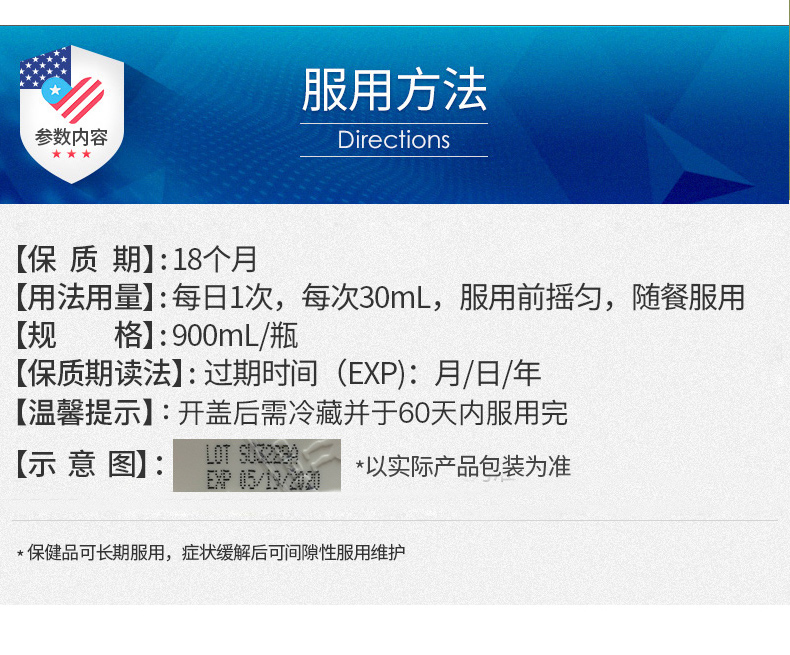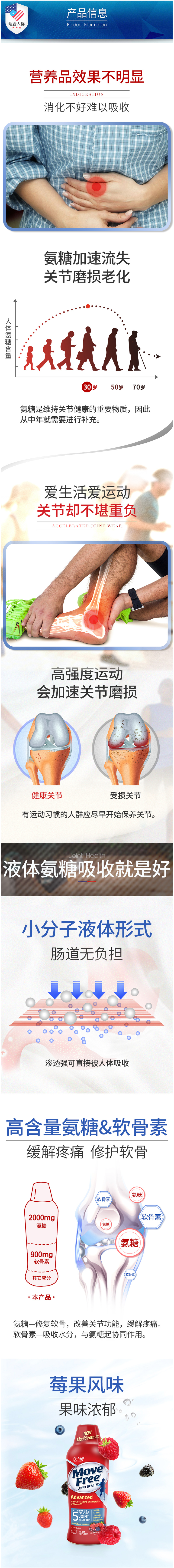 每30ml含软骨素 900mg、氨基 2000mg、甲基黄酰甲烷 500mg、钙 80mg,共900ml,每日1次,每次30ml,服用前摇匀,莓果风味,果味浓郁。