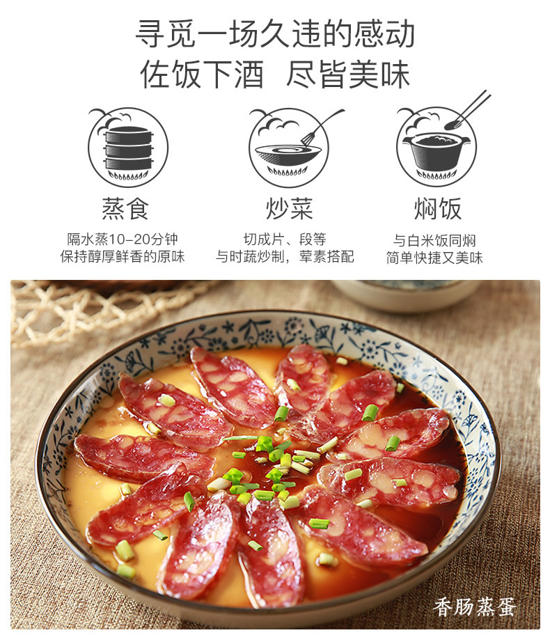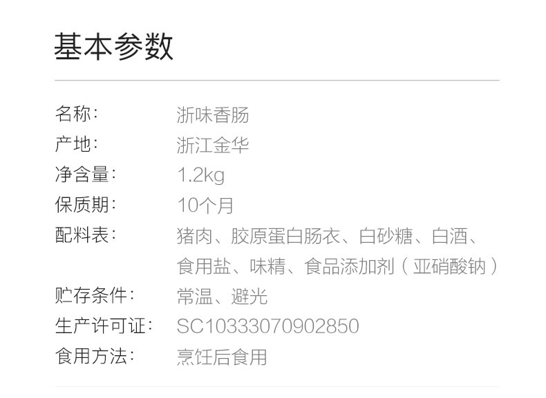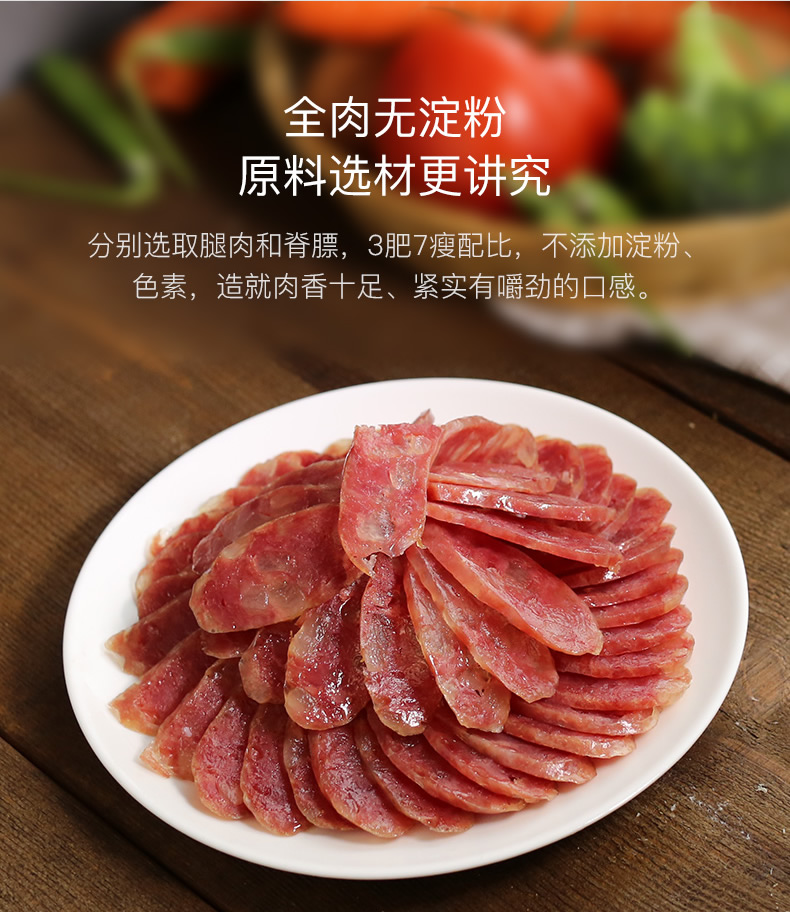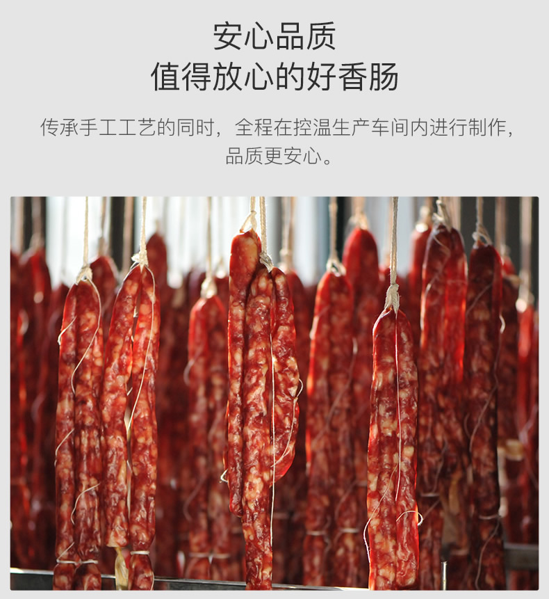 这款金字 浙味腊肠香肠,精选肥瘦均匀好猪肉原料,采用地道的糖酒风味配方,以糖中和调味、嫩化肉质,以酒激发鲜味、增加醇香,造就鲜、香、微甜的风味。遵循传统腊肠制作技艺,历经十几道工序制成,外形紧致、色泽光润,肉质紧实有嚼劲。标准化生产车间,食用健康安全。
