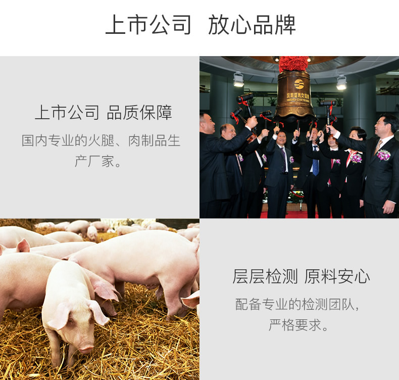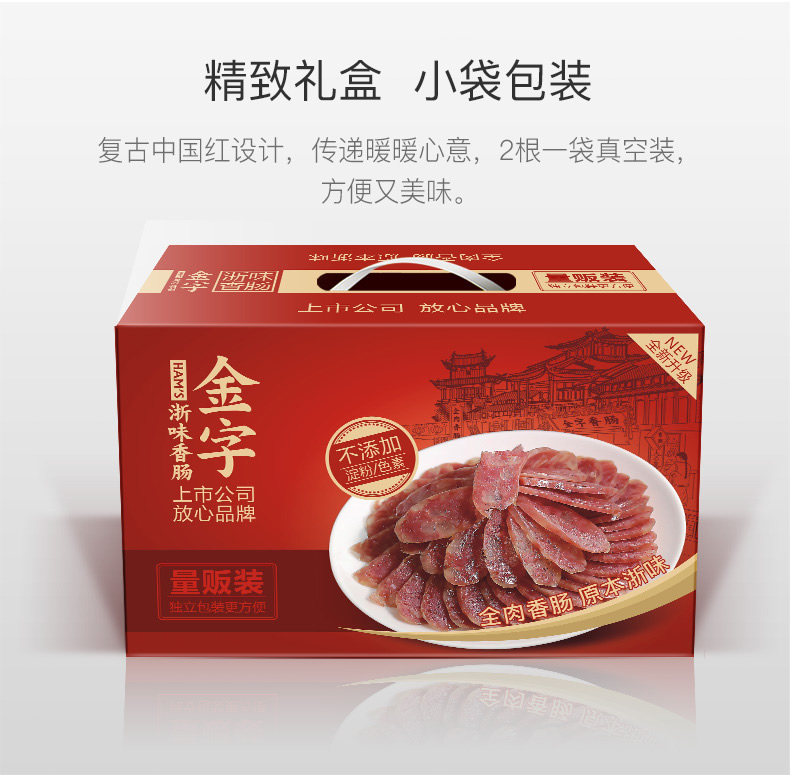 金字火腿股份有限公司创办于1992年8月,2004年被认定为“浙江省科技农业企业”,2010年12月3日,成为业内首家A股上市公司,股票代码:002515。同时公司也是《地理标志产品 金华火腿》国家标准主要起草单位、国内首个发酵肉制品标准制订者。