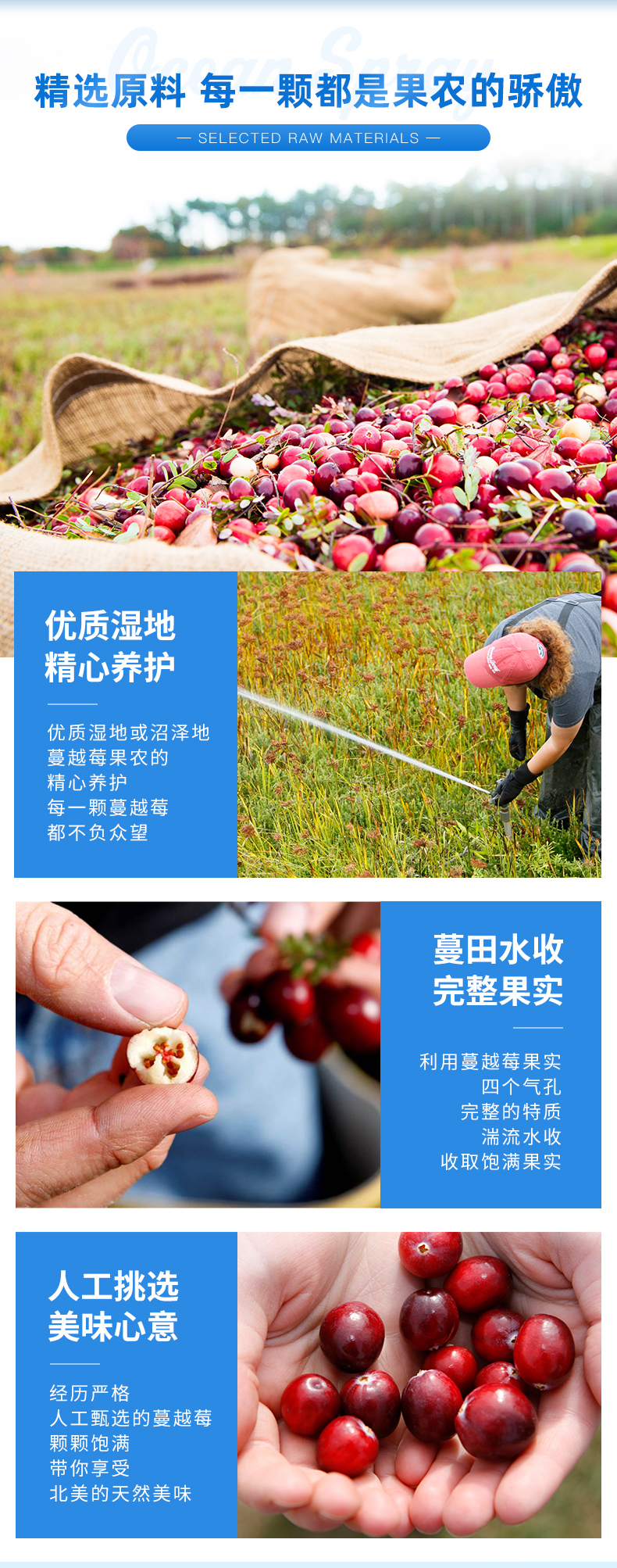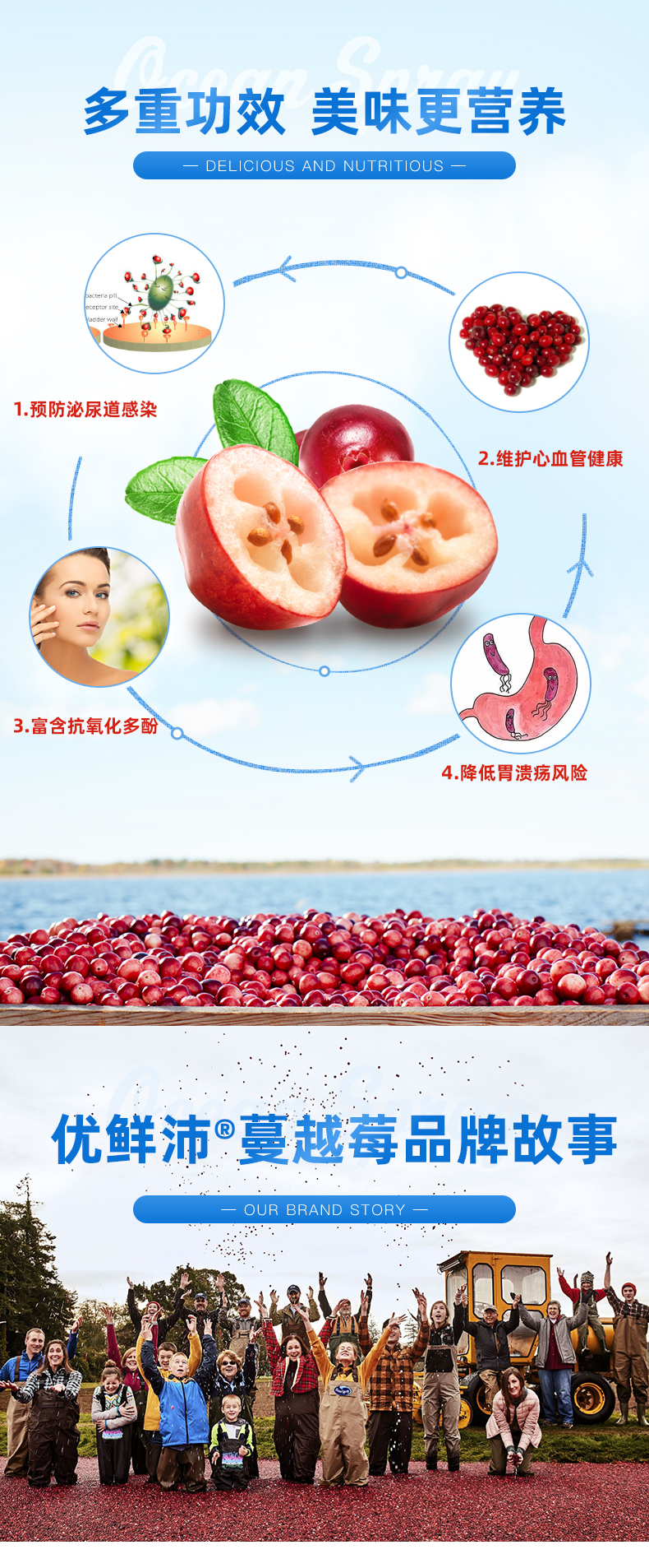 优鲜沛(Oceanspray),是有着75年悠久历史的美国果汁饮料与食品产业巨头,是北美最大的罐装和瓶装果酱生产商,在整个北美地区拥有超过600个大型种植园,给全球各地的消费者提供最优质的产品。作为全球最大蔓越莓供应商,目前全世界超过60%的蔓越莓都来自优鲜沛(Ocean Spray)公司,