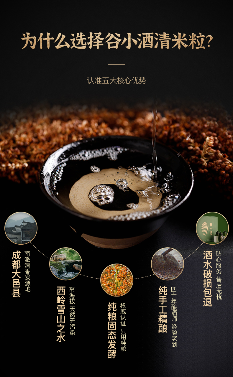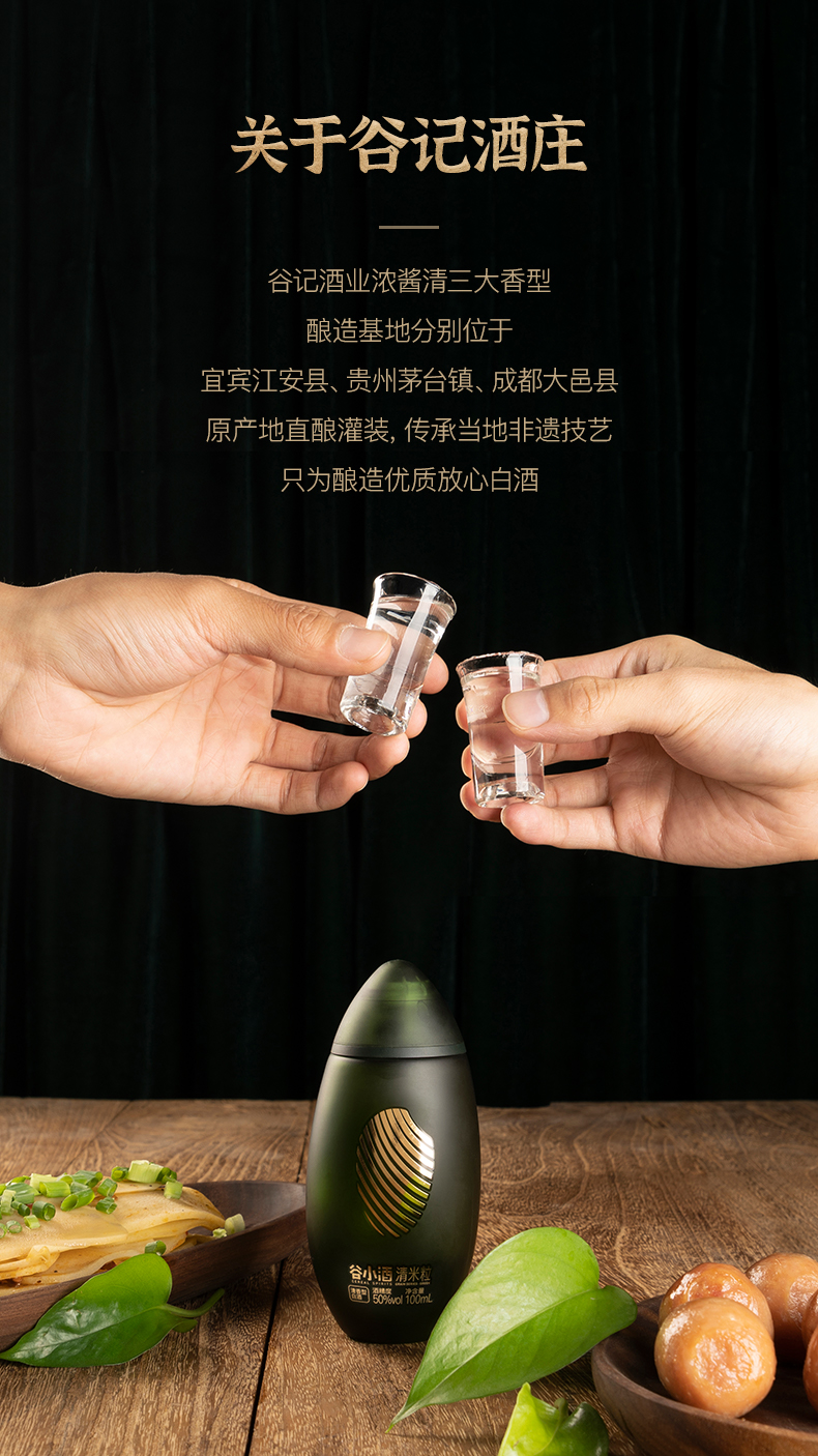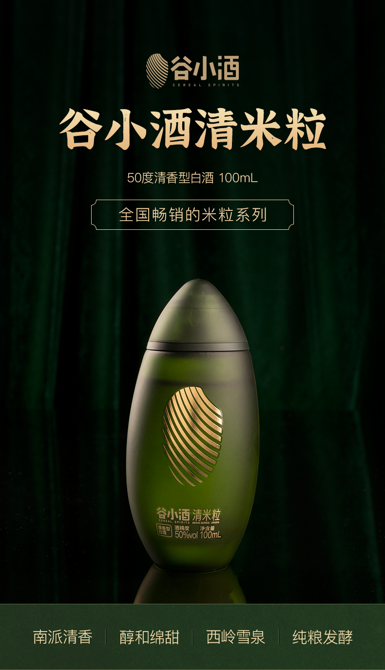 谷小酒系列 清米粒,源自南派清香型白酒发源地成都大邑县,精选高粱、大豆、豌豆为原料,纯粮固态发酵酿,酒香清雅怡人,诸味自然协调,入口绵柔醇和,回甘润甜舒适,后劲回味悠长。