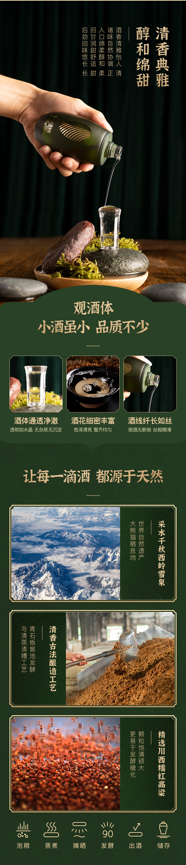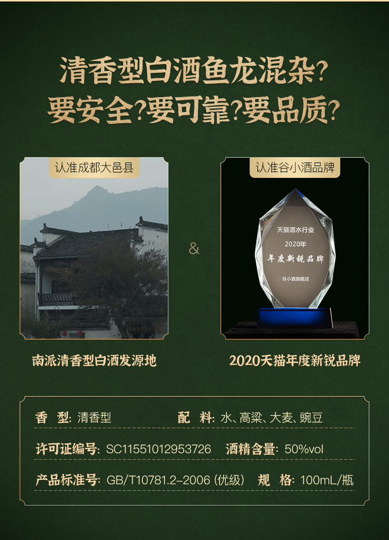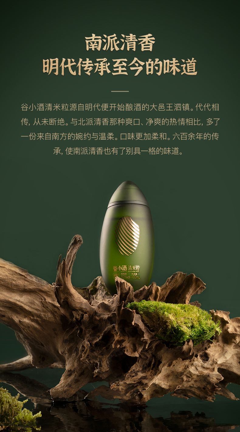 谷小酒系列 清米粒,源自南派清香型白酒发源地成都大邑县,精选高粱、大豆、豌豆为原料,纯粮固态发酵酿,酒香清雅怡人,诸味自然协调,入口绵柔醇和,回甘润甜舒适,后劲回味悠长。