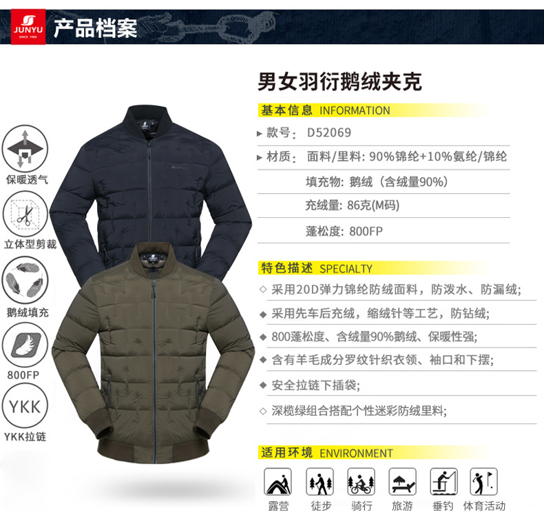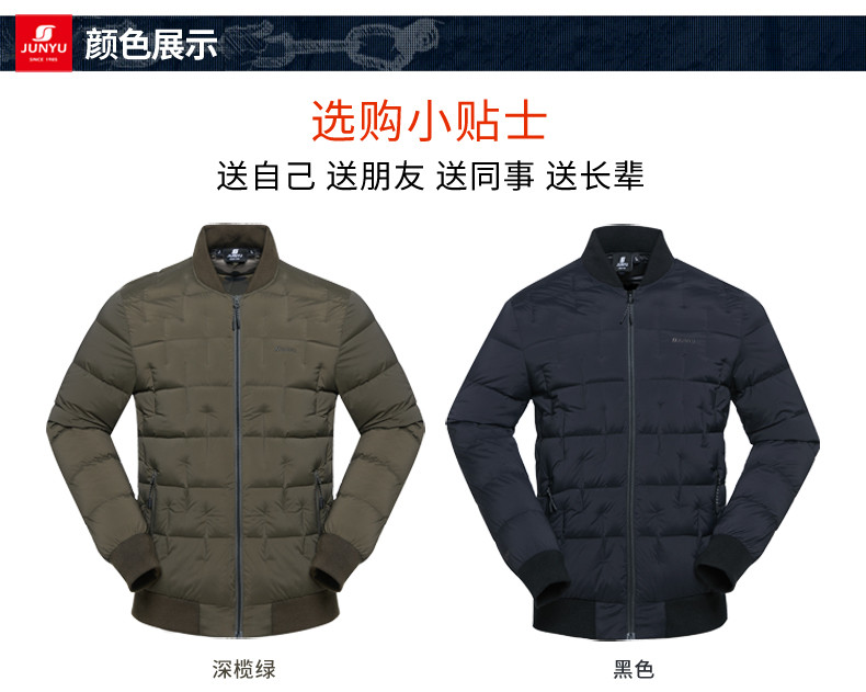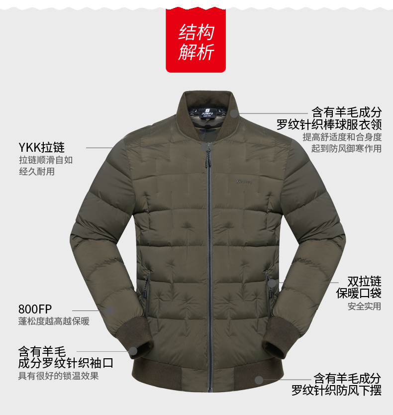 这款君羽季风男羽绒服是2019年的冬季款,属于君羽的严寒系列,填充800蓬90%的鹅绒,M码充绒量为86克,属于薄款厚度,外层是20D高密度尼龙面料,防小雨挡风防漏绒,休闲棒球领,适合0℃到-10℃穿着。