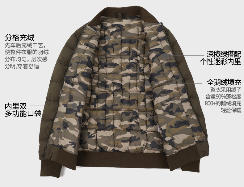 「防钻绒处理」面料与填充的羽绒,使用先车出羽绒隔舱,后充绒的方法,在制作外层面料过程中,羽绒隔舱就预先织出来,后填充羽绒,这样可有效避免羽绒从针眼钻绒。