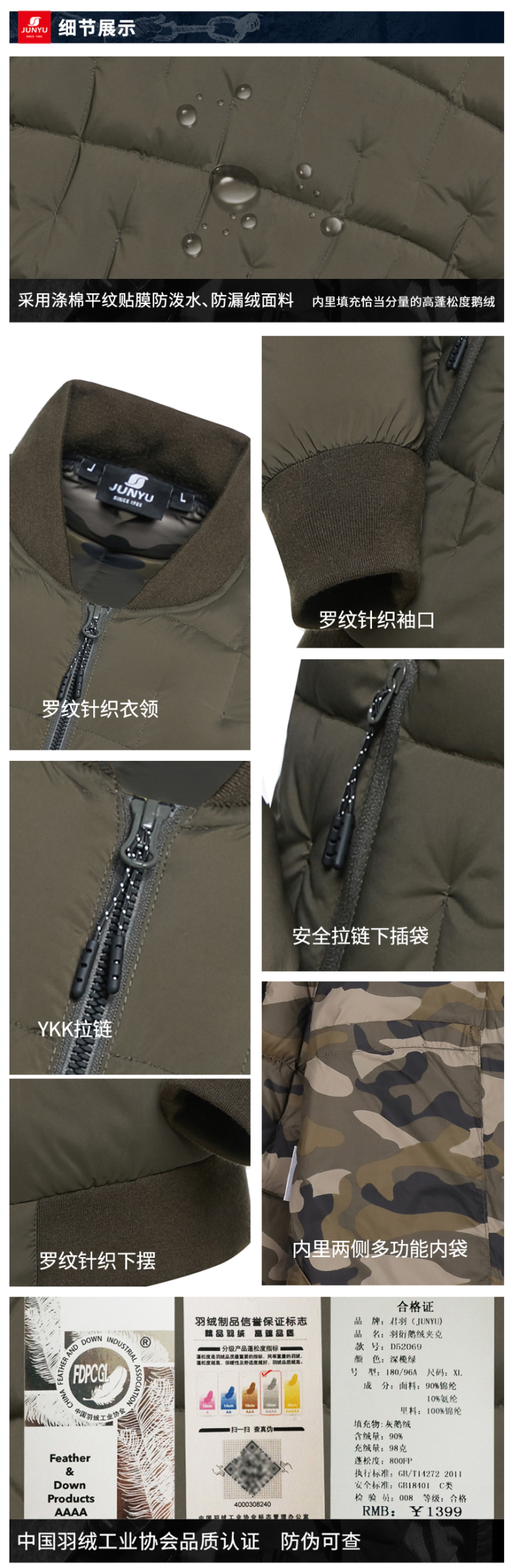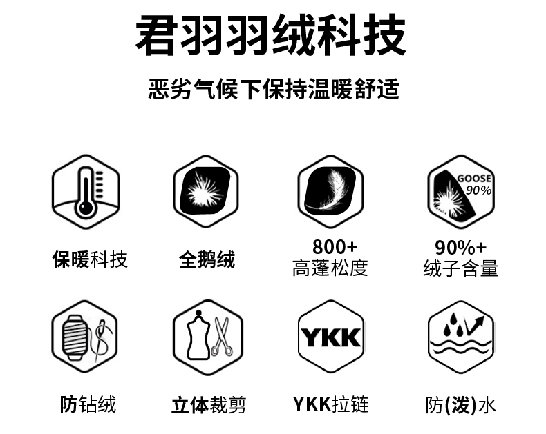 「鹅绒」800蓬鹅绒成本约是普通鸭绒的10倍,没有鸭毛的腥味,保暖效果更好:「86克 800蓬鹅绒」≈「112克 700蓬普通鹅绒」≈「160克普通鸭绒」,可以穿的又轻又暖。