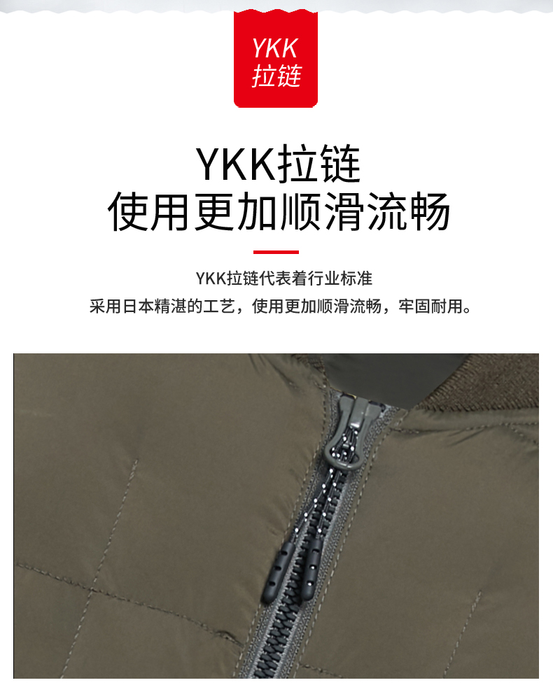 在款式和细节方面,合身版型,3D立体裁剪。休闲夹克款式,棒球领、罗纹针织袖口和下摆,都含有羊毛成分,提高了舒适度和合身度,还能保暖抗寒。主拉链和两侧口袋拉链都是YKK的。
