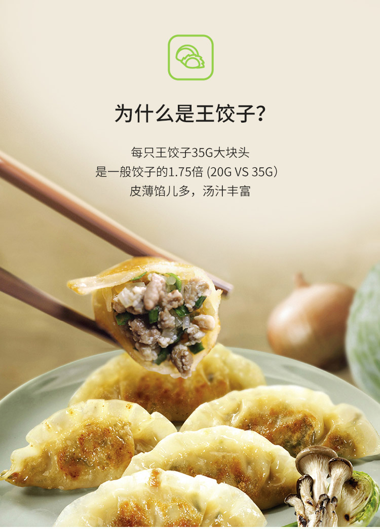 1.个头大,单只有35g,是一般饺子的1.75倍,日常500g的思念或者三全,我要一袋半才能吃饱,这个一袋就行,可能是给胃形成了错觉吧,吃了这么多