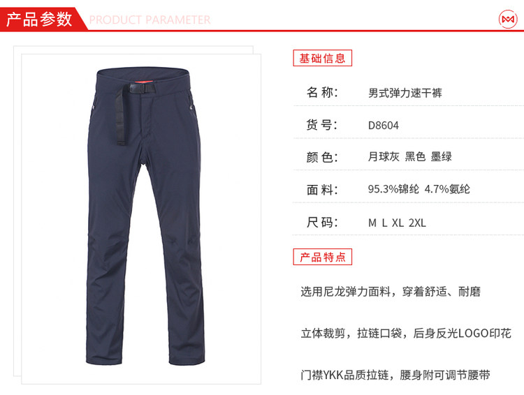 这款速干裤使用轻薄速干尼龙面料,通常在雨天淋湿后不到1小时就能干,上身不闷不潮,出汗时不沾身,是户外天热时很舒适的面料。还混有4.7%氨纶弹力纤维,使面料具有适度的弹力,伸展性好还抗皱,在腿部活动时没有拉扯紧绷感,具有良好的穿着体验。