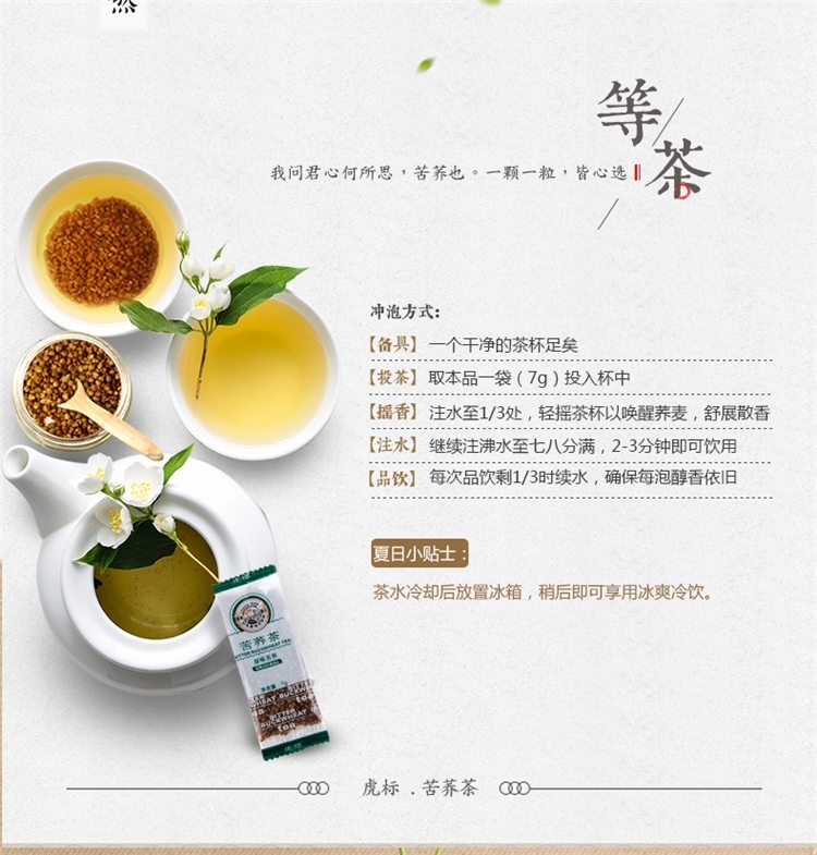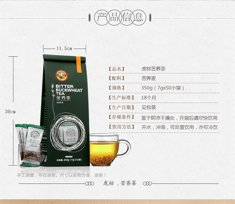 这款虎标苦荞茶,该茶是一种炒米茶,选用高寒山区优质鞑靼荞麦胚芽精制而成,富含粗蛋白、粗脂肪和人体所需的19种氨基酸等生物活性物质,有降血压、血糖、血脂,改善微循环的保健效果,冲泡出来的茶色泽金黄,入口是清新的麦香。