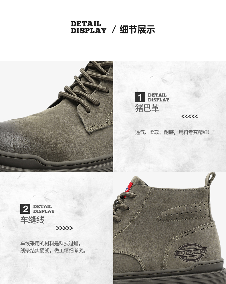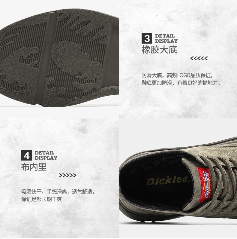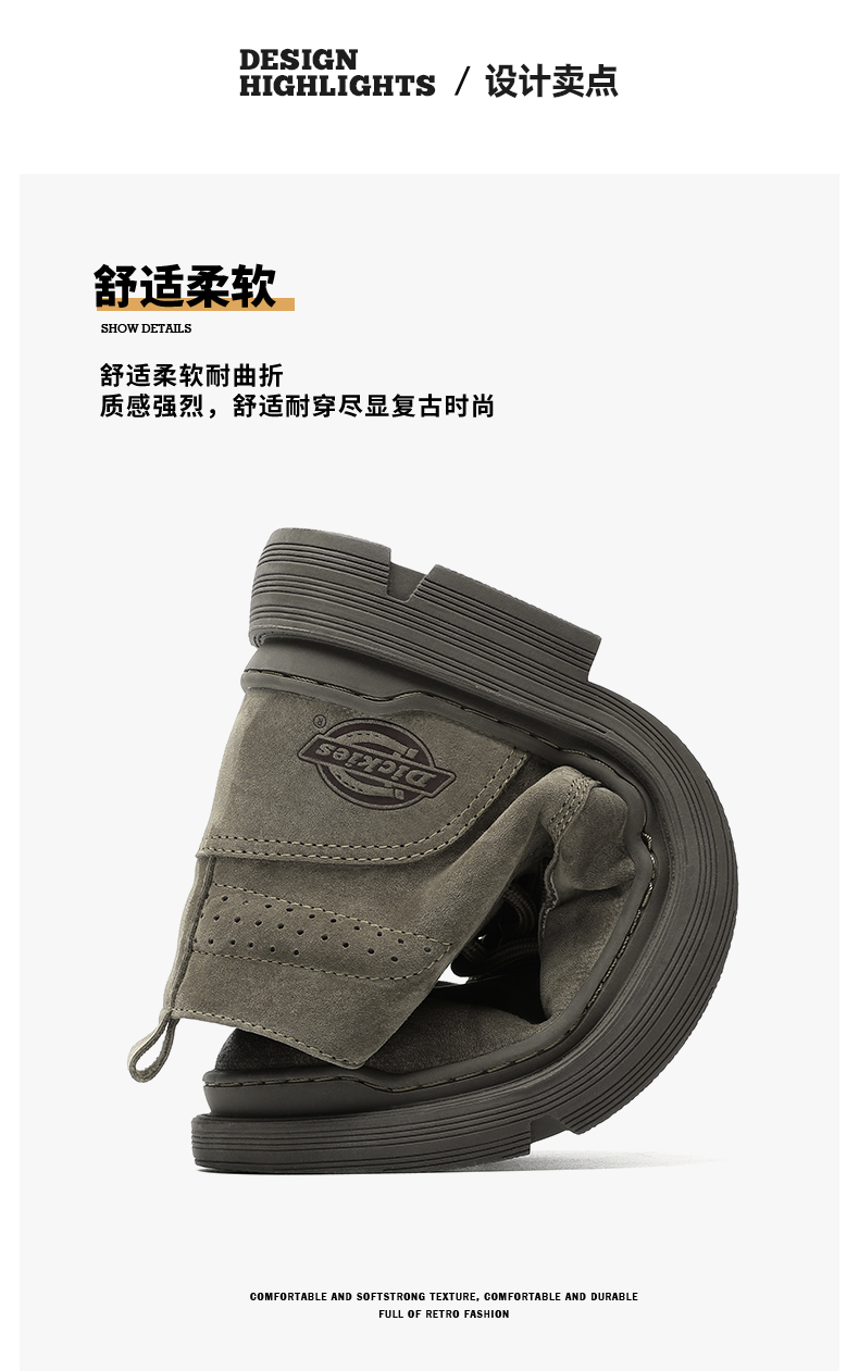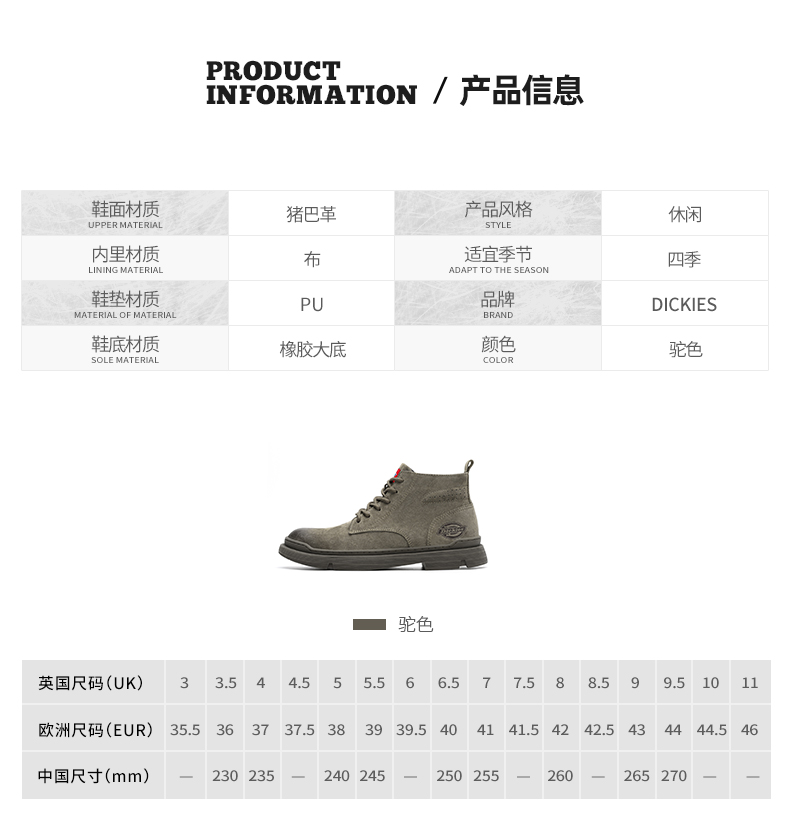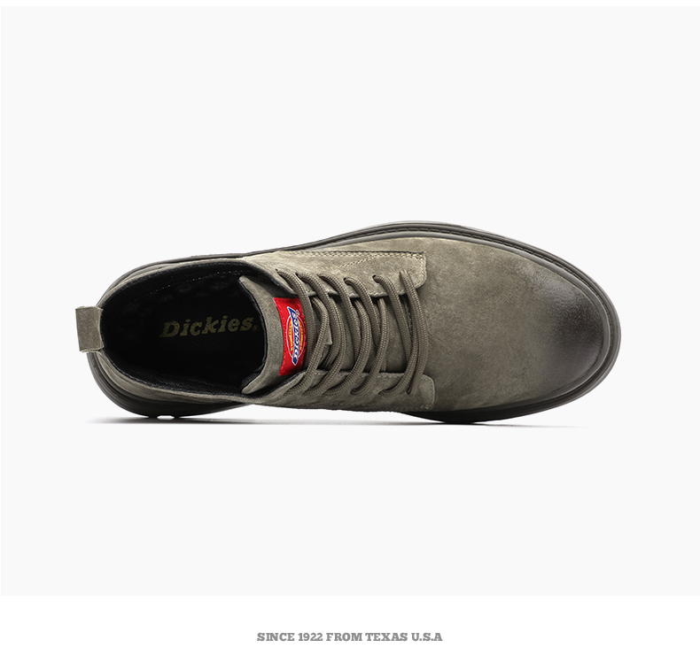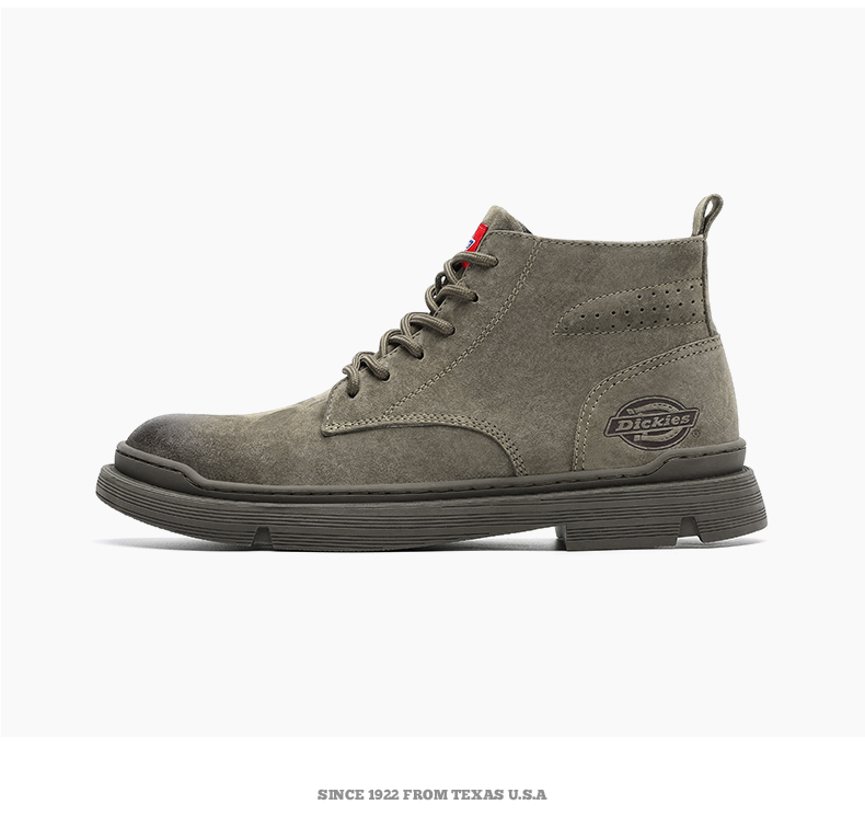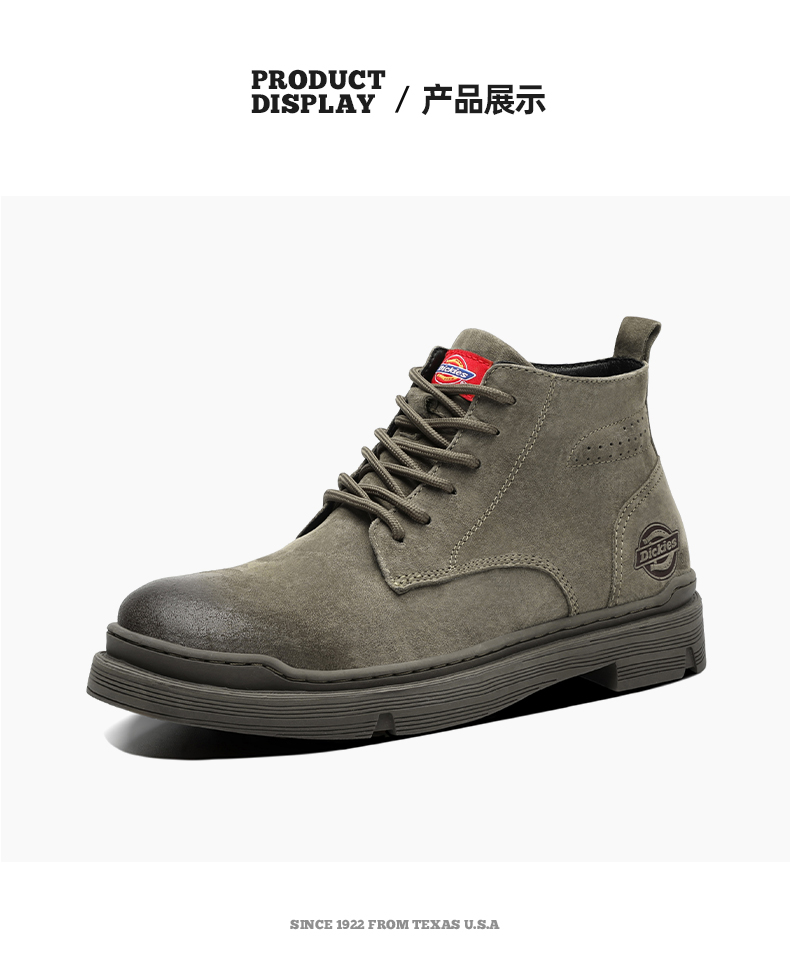 这款Dickies马丁靴选用优质猪巴革真皮鞋面,柔软透气性好,久穿不易捂汗。鞋底采用橡胶大底,拥有良好的柔韧性,而且还拥有杰出的抓地力、轻便、耐磨又耐用。整体工装风格,时尚百搭。