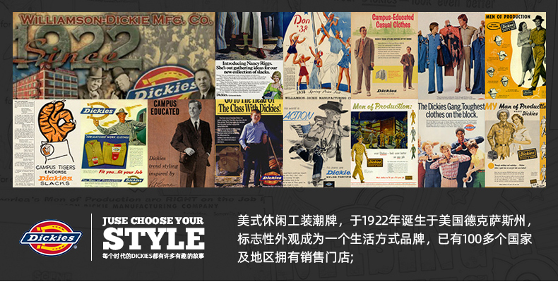 Dickies成立于1922年,成立之初是一家小型背带裤公司,现在发展成为美国知名潮牌潮流服装公司。为Dickies代言的名人数量众多,Avril Lavigne、SnoopDogg、The Black Eyed Peas都是经常穿着Dickies出现在户外的音乐明星,并且也成为海外代购的热门品牌。