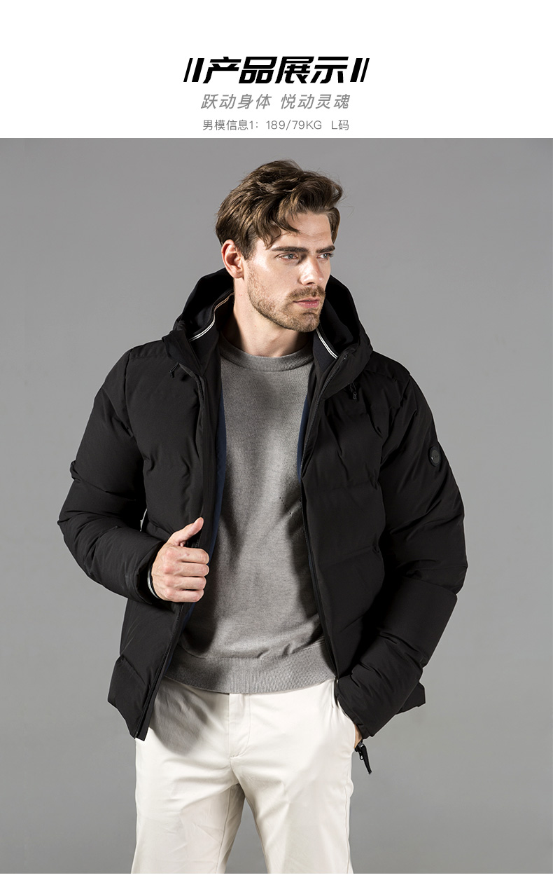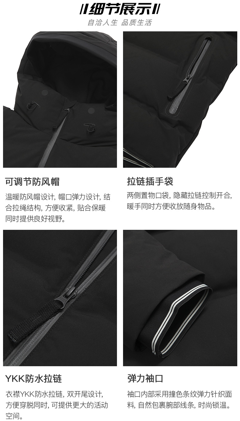 在款式和在细节方面,运动版型,方便冬季里面加衣服,上身也更舒适。高领一体连帽,帽口有弹力设计,搭配独立抽绳,能完全保护好脖子,不会漏风。收紧抽绳后,除了能防风保暖,还不影响视野。