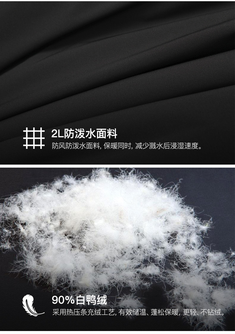 面料的接缝处采用热贴合工艺代替传统的缝线,将羽绒分区,减少缝线造成的表布缝线孔,从而减少绒丝溢出,增强衣服的防风防水保暖性能,同时也能更轻。
