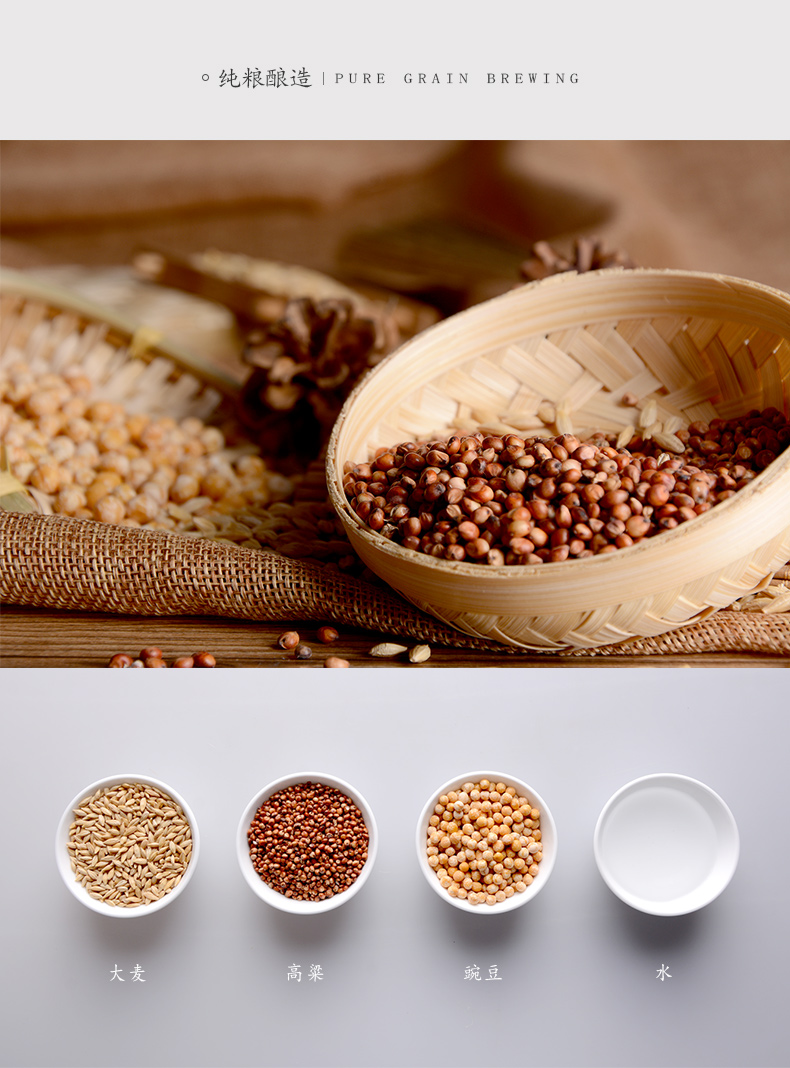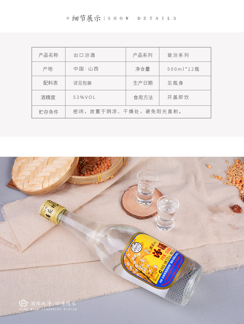 这款汾酒产地是山西杏花村,由大麦、高粱、豌豆、水为原料酿成的汾酒,手工古法纯粮酿造,酒质晶莹剔透,经久不散,酒花细腻均匀,酒线细长,挂杯粘稠,口感醇厚,好喝不上头。