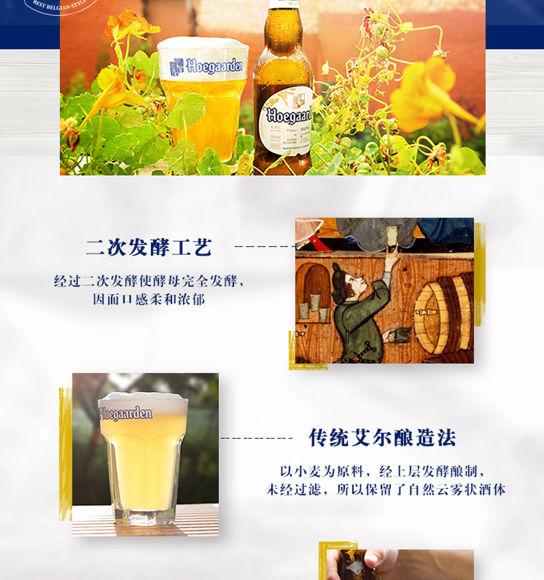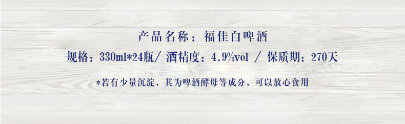 使用传统的艾尔上层发酵酿制未经过滤,所以在啤酒中保留了发酵时的酵母使得酒体浑浊并有少许沉淀,饮用前摇一摇,使酒体与沉淀混合均匀,赋予啤酒烟雾弥漫的感觉。浓密麦芽汁浓度11.7°P,酒精含量4.9%vol。规格:330ml*24瓶。