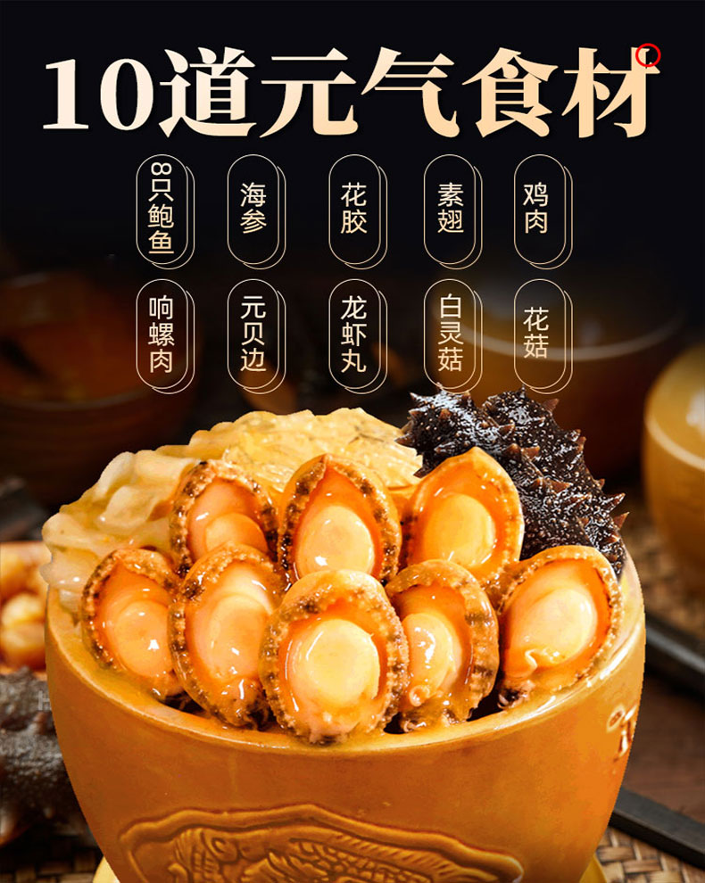 礼盒装金汤佛跳墙,年夜饭硬核头菜!法式金汤底,不含淀粉,鲍鱼,海参,花胶,鸡肉,响螺肉,元贝边,素鱼翅,龙虾丸,白灵菇,花菇等10道元气食材,低脂高营养,送人还是自己吃都有档次!领券链接点此