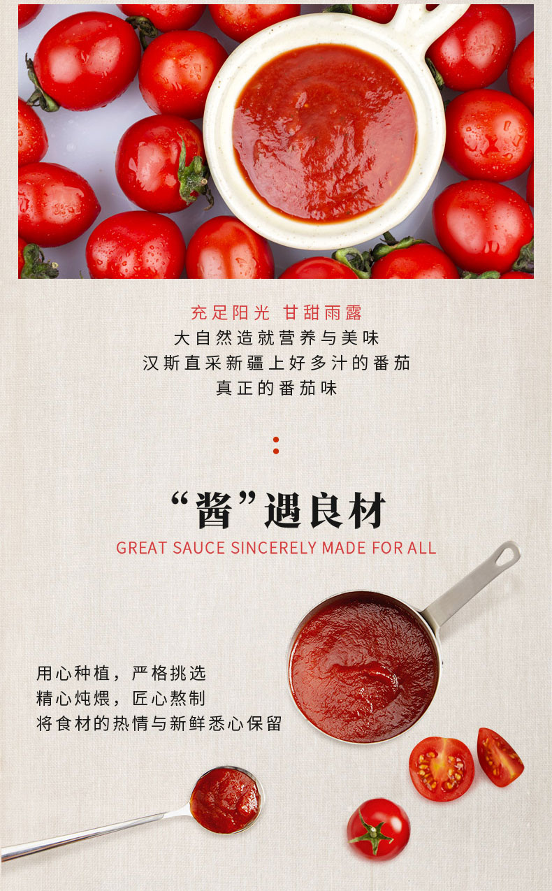这款汉斯意大利面酱,是经典的番茄口味,精选新疆的优质番茄加工,不添加人工防腐剂、色素、淀粉、增稠剂,无油工艺,最后巴氏杀菌罐装,健康又安全。