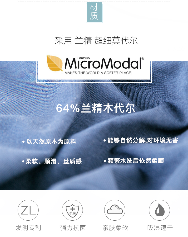 莫代尔是我最喜欢的内裤面料,和纯棉比,莫代尔手感更柔,吸湿更快更干爽,连续穿几天也没有棉质内裤松懈。莫代尔面料要混入氨纶弹力纤维,拥有弹力贴身的穿着感,又不会像尼龙或聚酯纤维有明显的紧绷感。