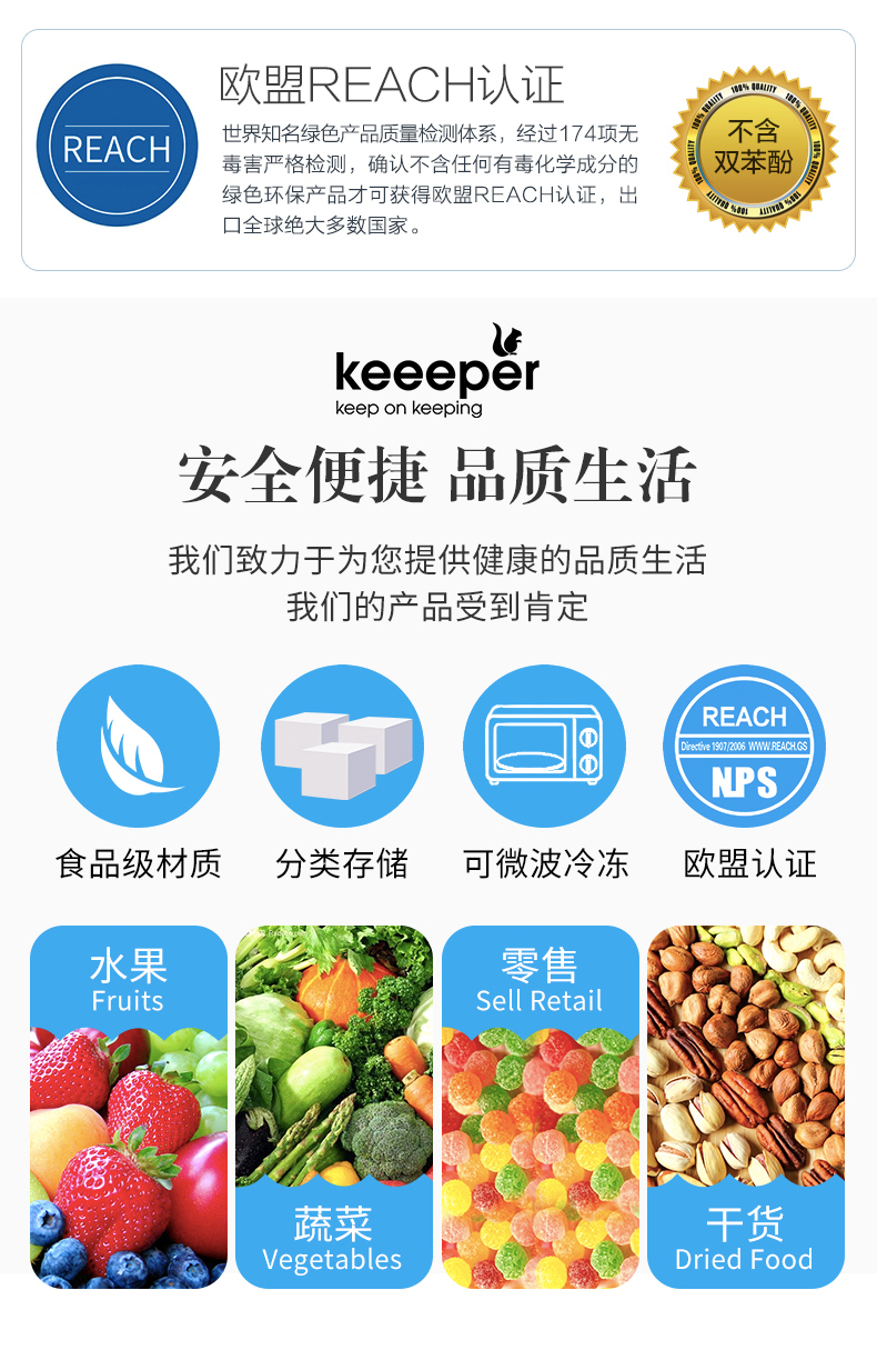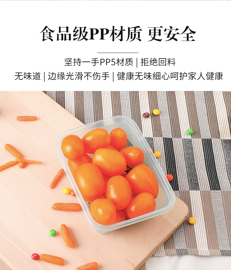 本品经欧盟REACH认证,不含任何有毒化学成分,绿色环保;食品级PP材质,健康无味,使用安全放心;耐受温度在零下20摄氏度到100摄氏度之间,可加热可冷藏;密封保鲜,防潮不漏水;盒盖掀手设计,开盖省力;磨砂透明盒身,一目了然,拿取方便。
