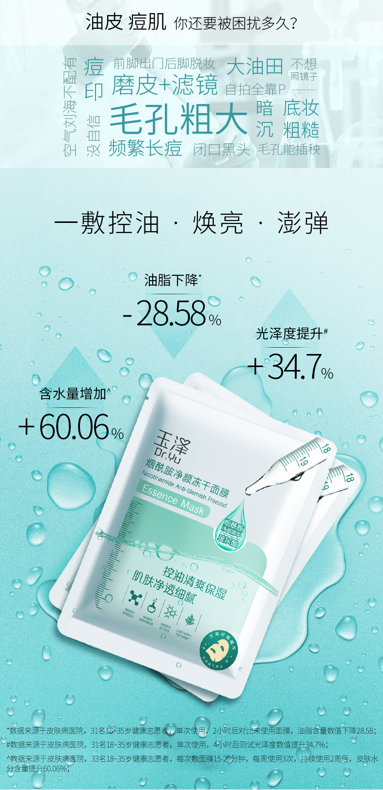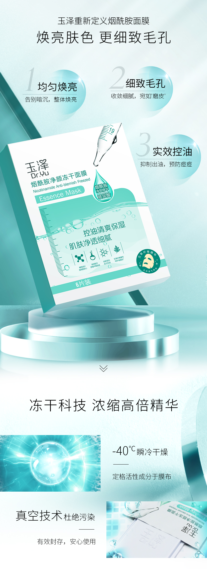 这款玉泽 烟酰胺净颜冻干面膜 450mg*6片,富含99.2%高纯度烟酰胺,采用冻干科技,添加了浓缩高倍精华,如海岸松树皮精华10-羟基癸酸:双效加乘控油力,预防痘痘;生物糖胶-1:舒缓痘肌干、红、肿、痛。天然艾草本色抗菌膜布,专为油皮研发,均匀焕亮,告别暗沉,整体焕亮,细致毛孔,收敛细腻,宛如磨皮,实效控油,抑制出油,敏感肌适用。