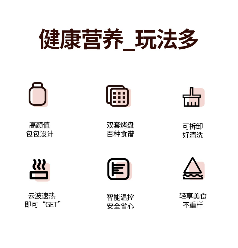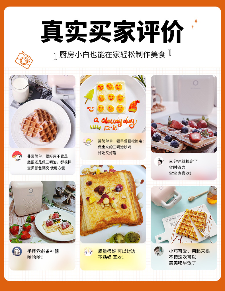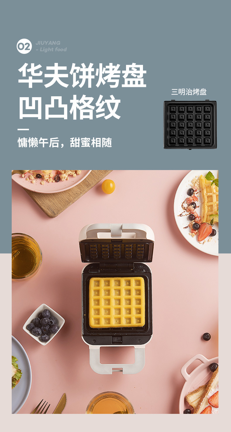 百种美味创意食谱。这款九阳 轻食料理机,高颜值小巧好用,可以做个三明治、华夫饼等,双面均匀加热,煎蛋、煎香肠也可以,仅需一开、一放、一合三步,即可享用美味。