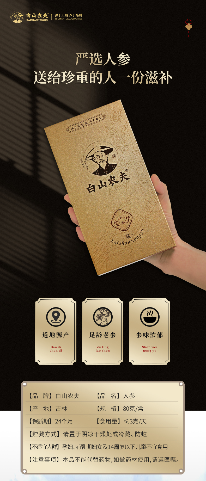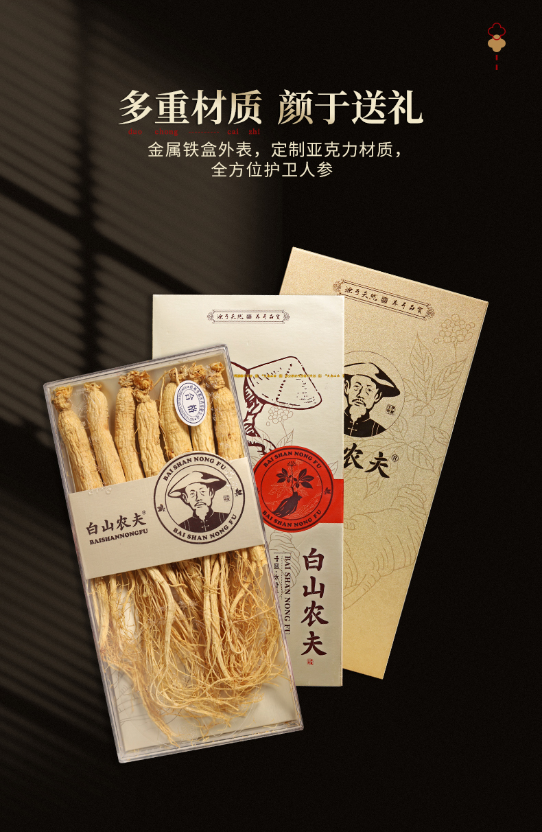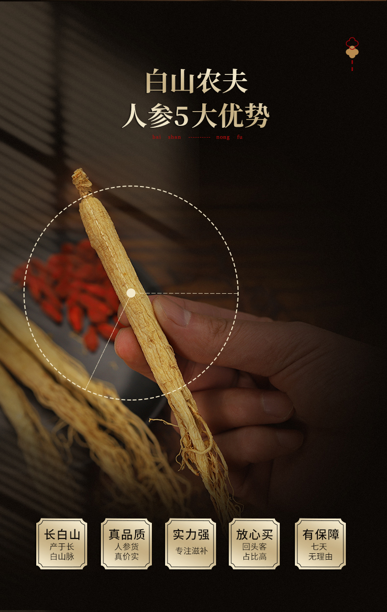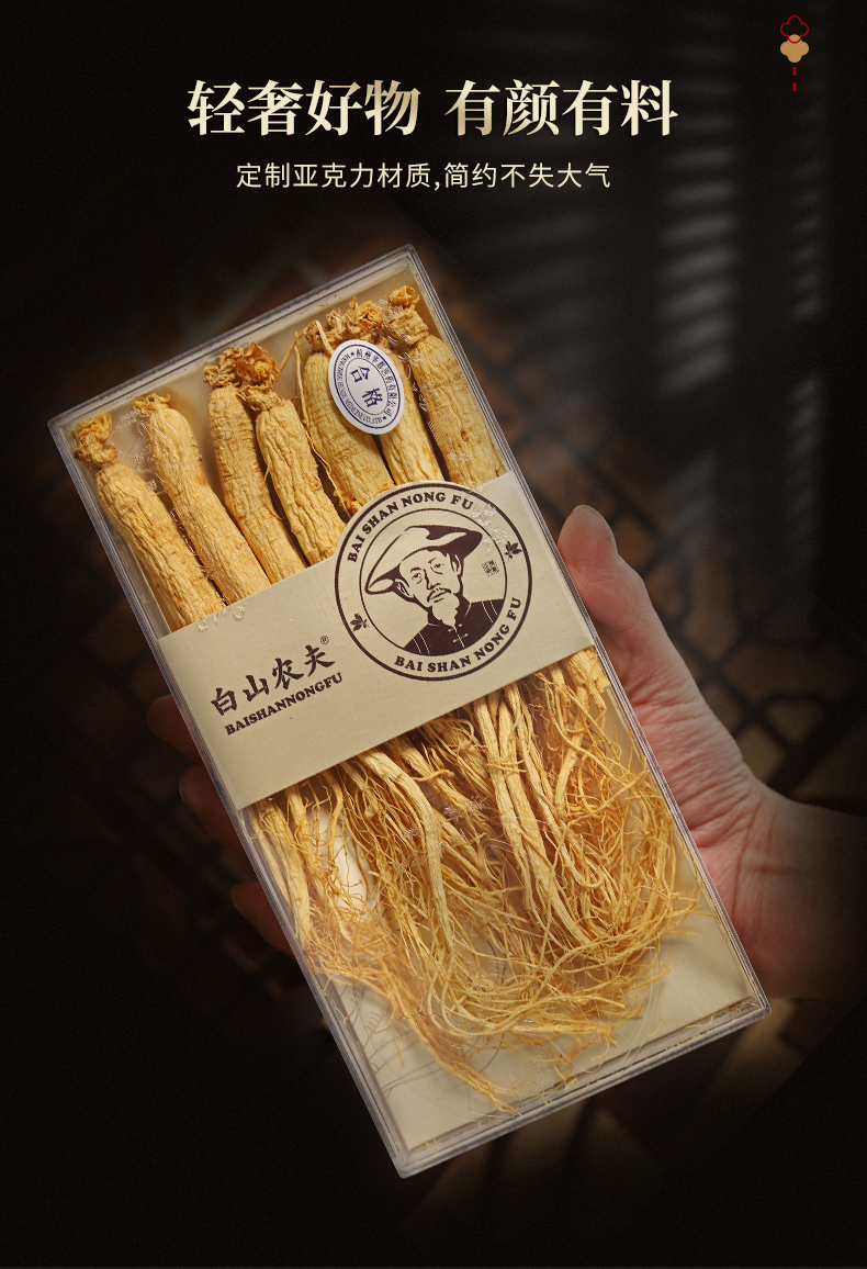 这款白山农夫人参,源自长白山吉安,是人工种植的,已有5年,饱满干燥,皮老紧密,纹理清晰,无硫磺、零添加,无农残,芦头紧密,螺旋纹深,根须完整,可以泡酒、切片泡茶、煲汤、熬粥。