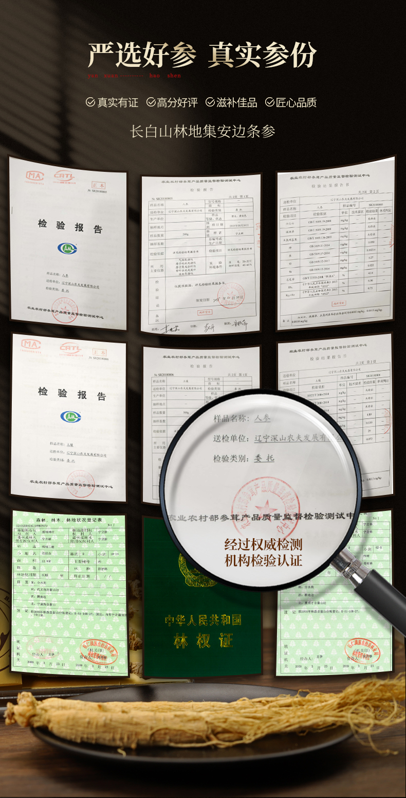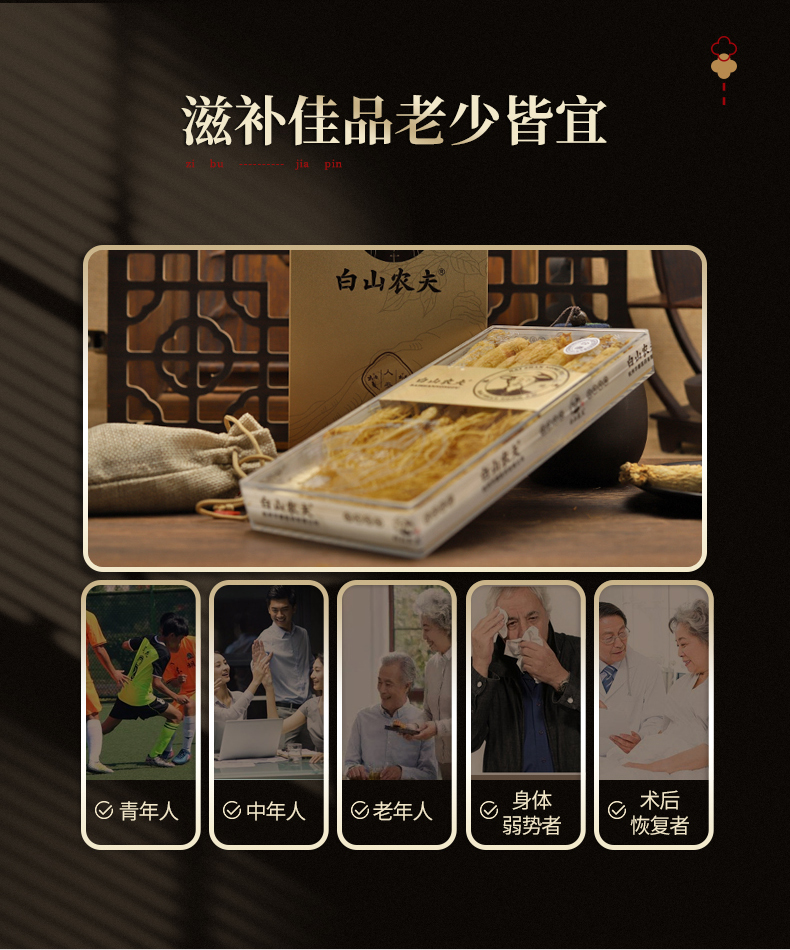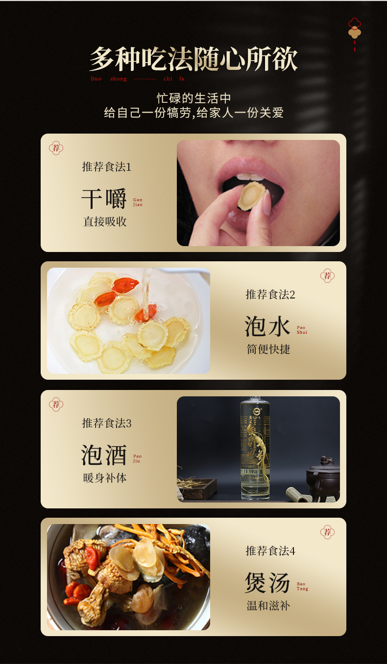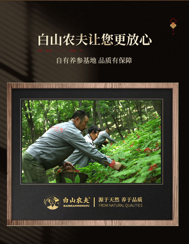 这款白山农夫人参,源自长白山吉安,是人工种植的,已有5年,饱满干燥,皮老紧密,纹理清晰,无硫磺、零添加,无农残,芦头紧密,螺旋纹深,根须完整,可以泡酒、切片泡茶、煲汤、熬粥。