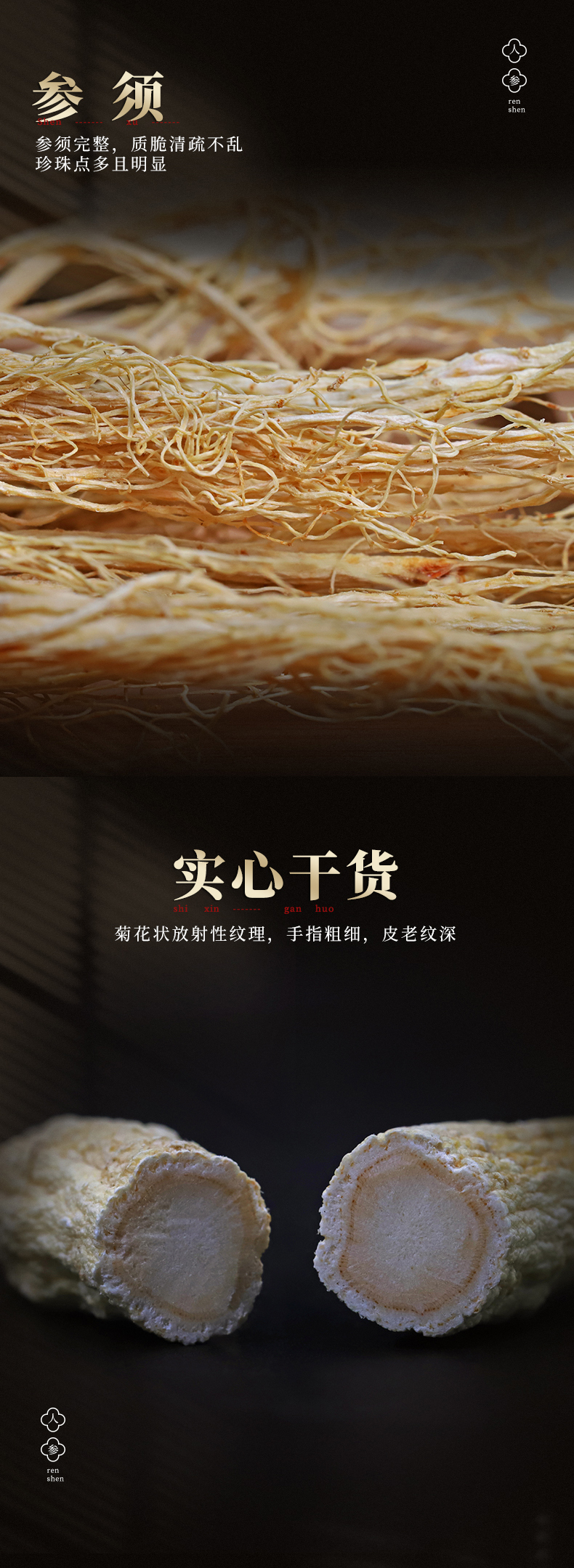 人参须,随着年龄增长,参体会越发饱满,表皮紧实有光泽,营养聚集根须才会粗壮。