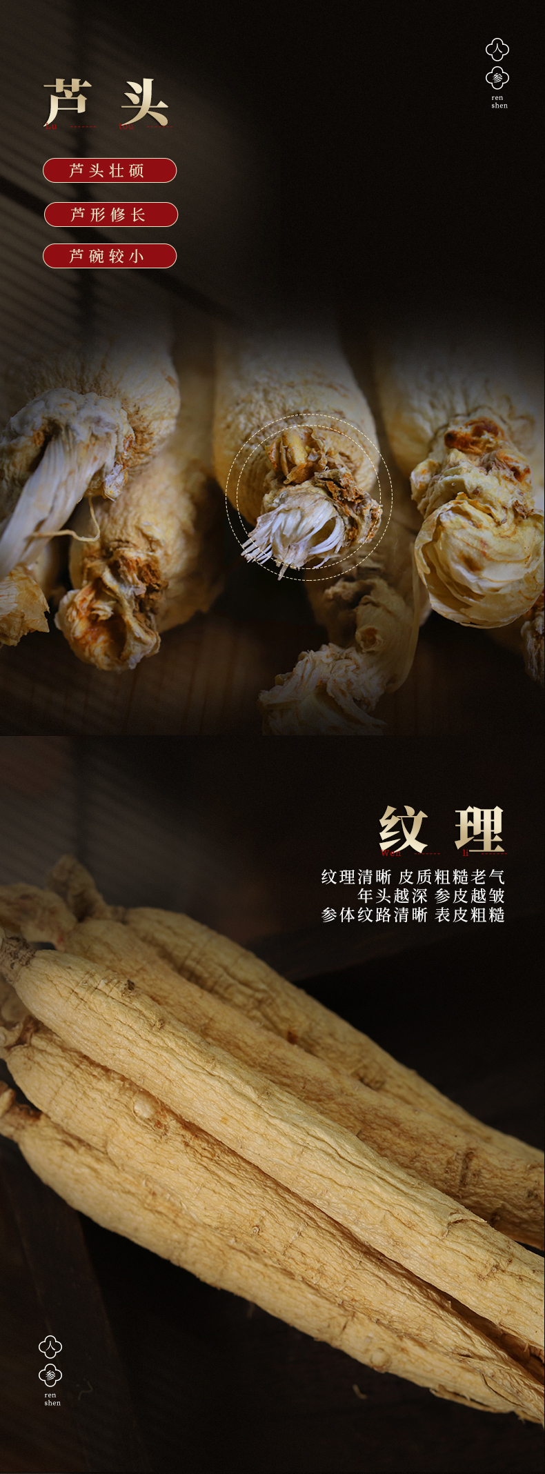 芦头,参芦是人参的根基,好的人参芦头较长,芦碗排列紧密清晰。