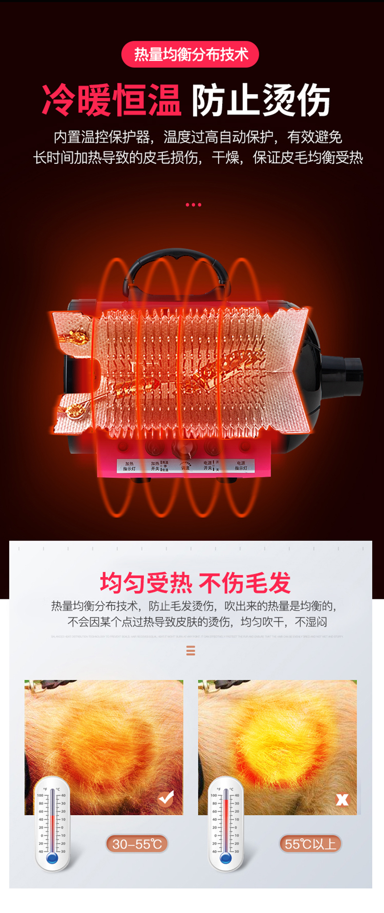 内置温控保护器,温度过高自动保护,有效避免长时间加热导致的皮毛损伤、干燥,保证皮毛均衡受热。